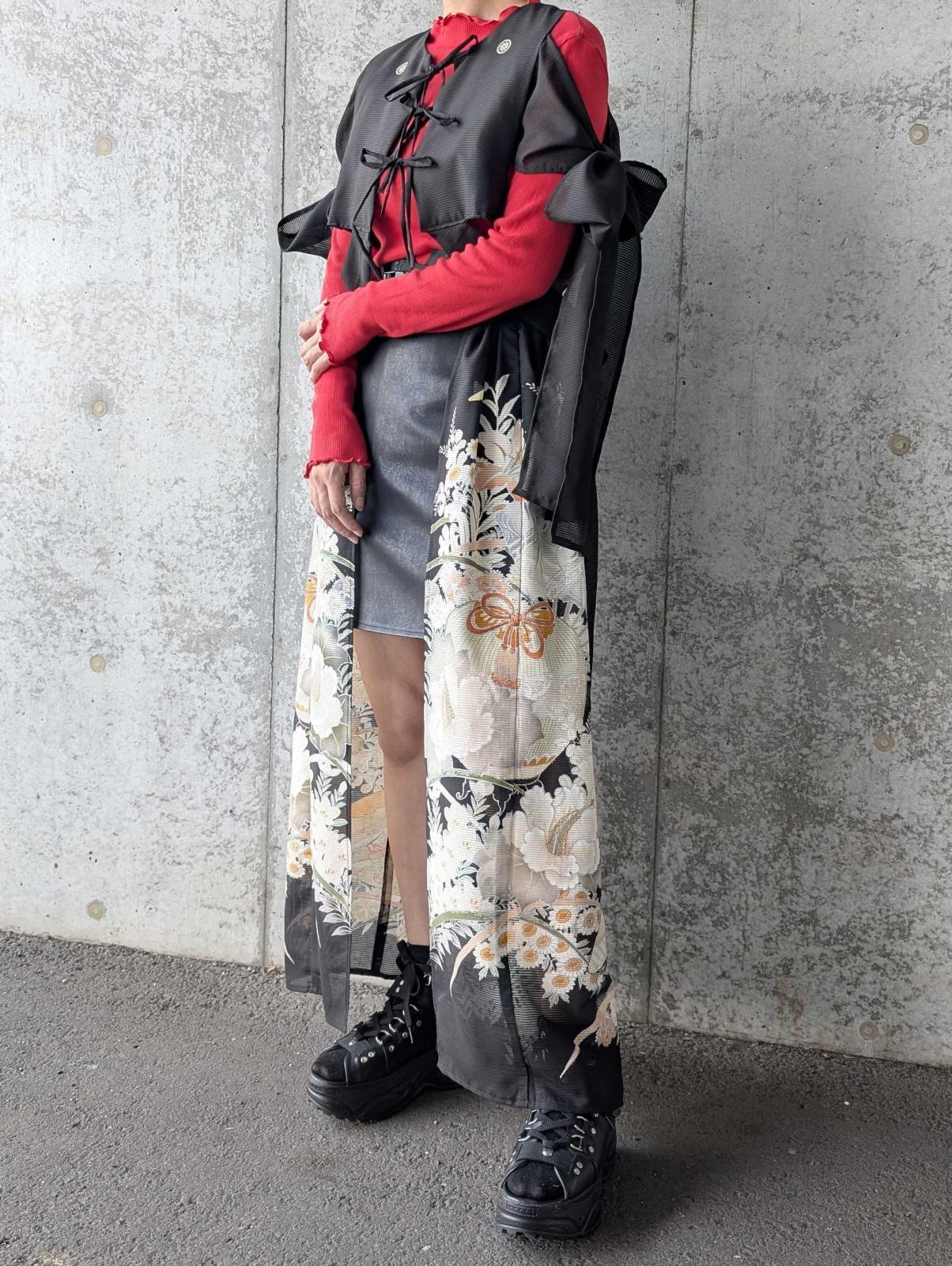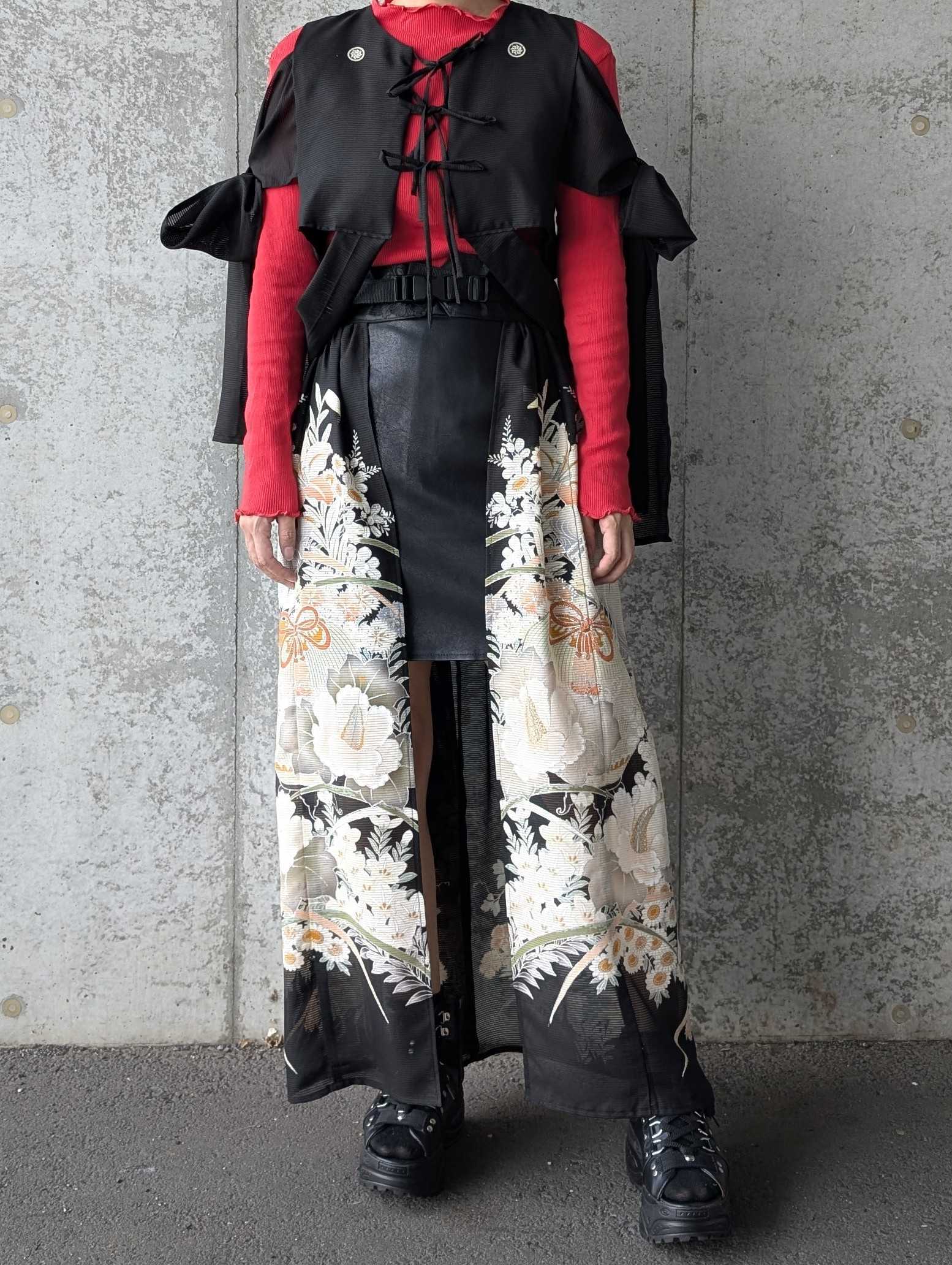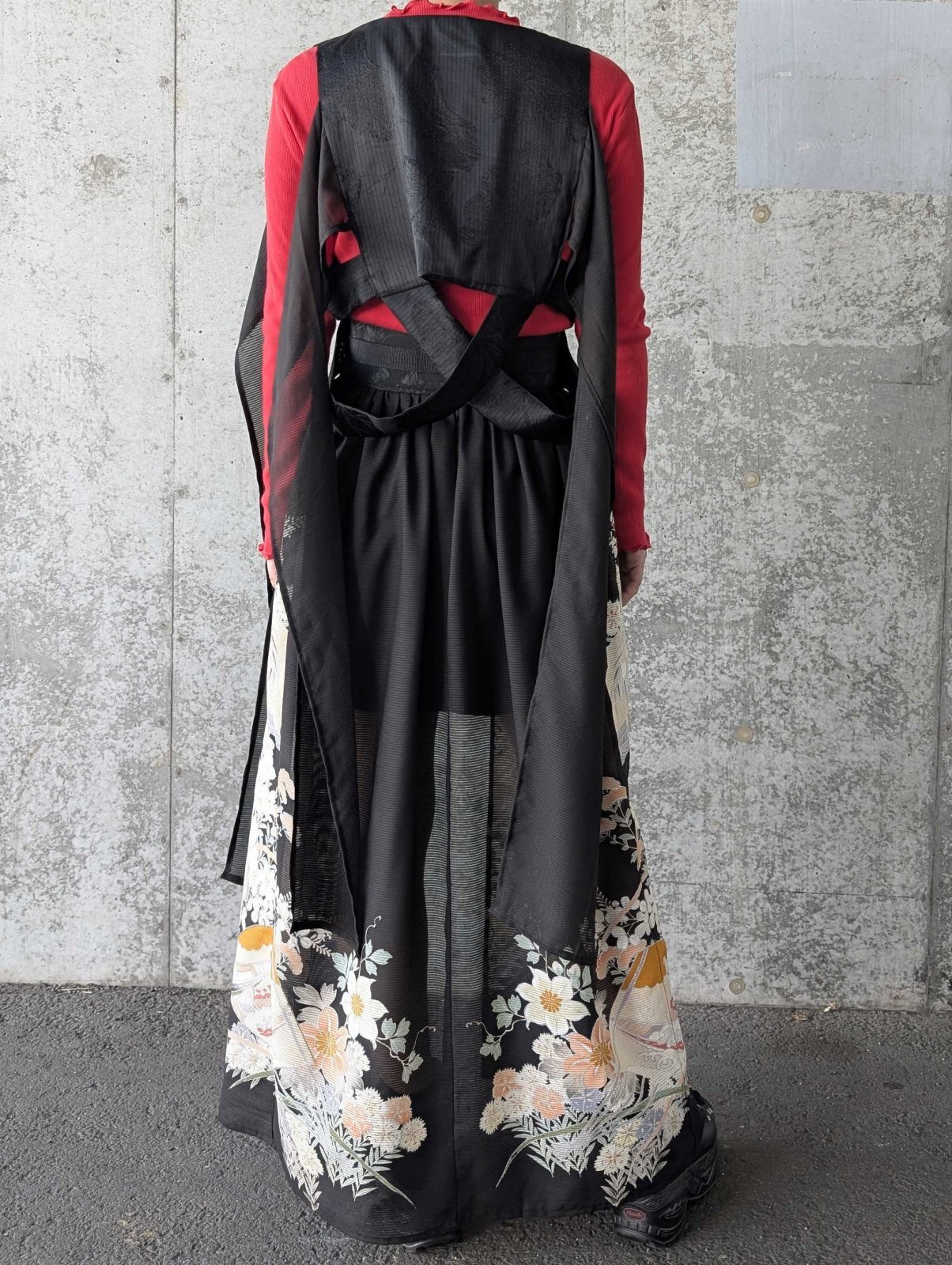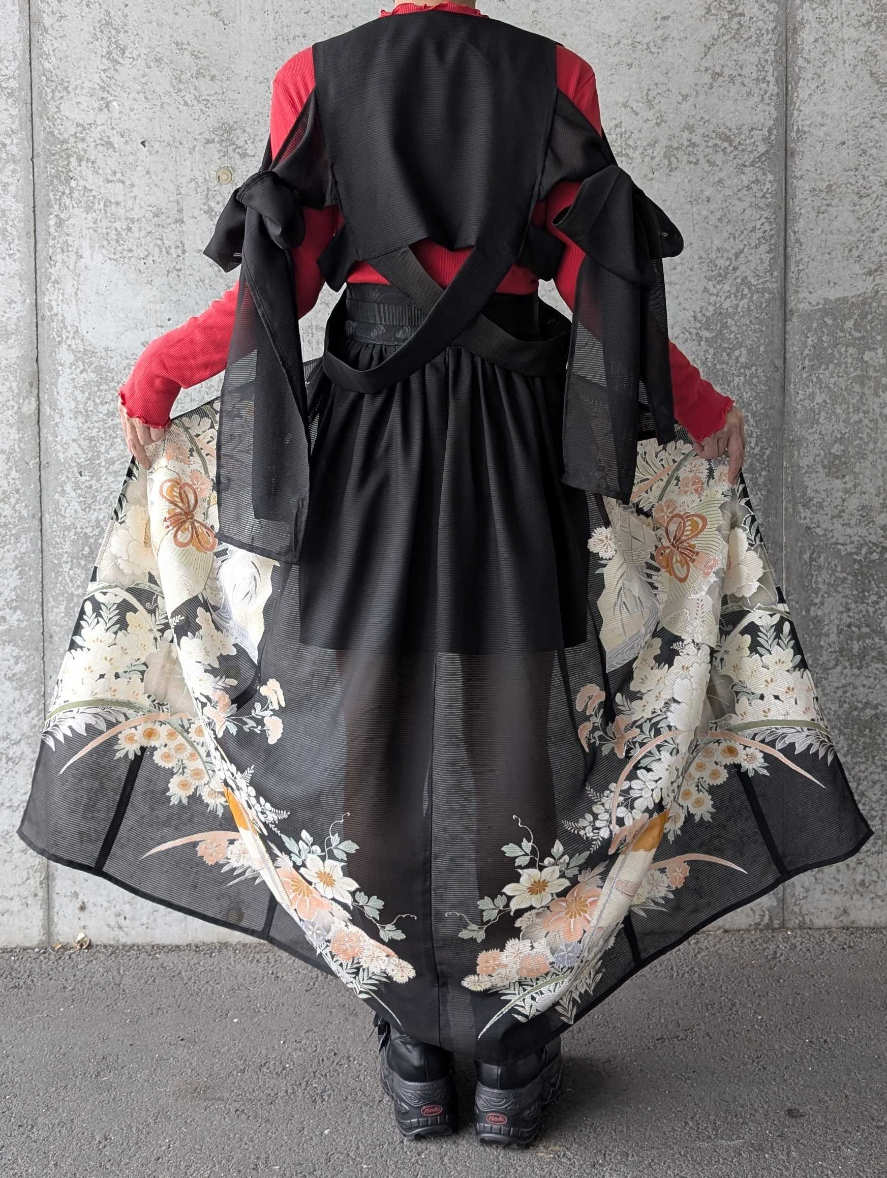 アンティークの黒留袖をリメイクしたオーバースカートのセットアップ。