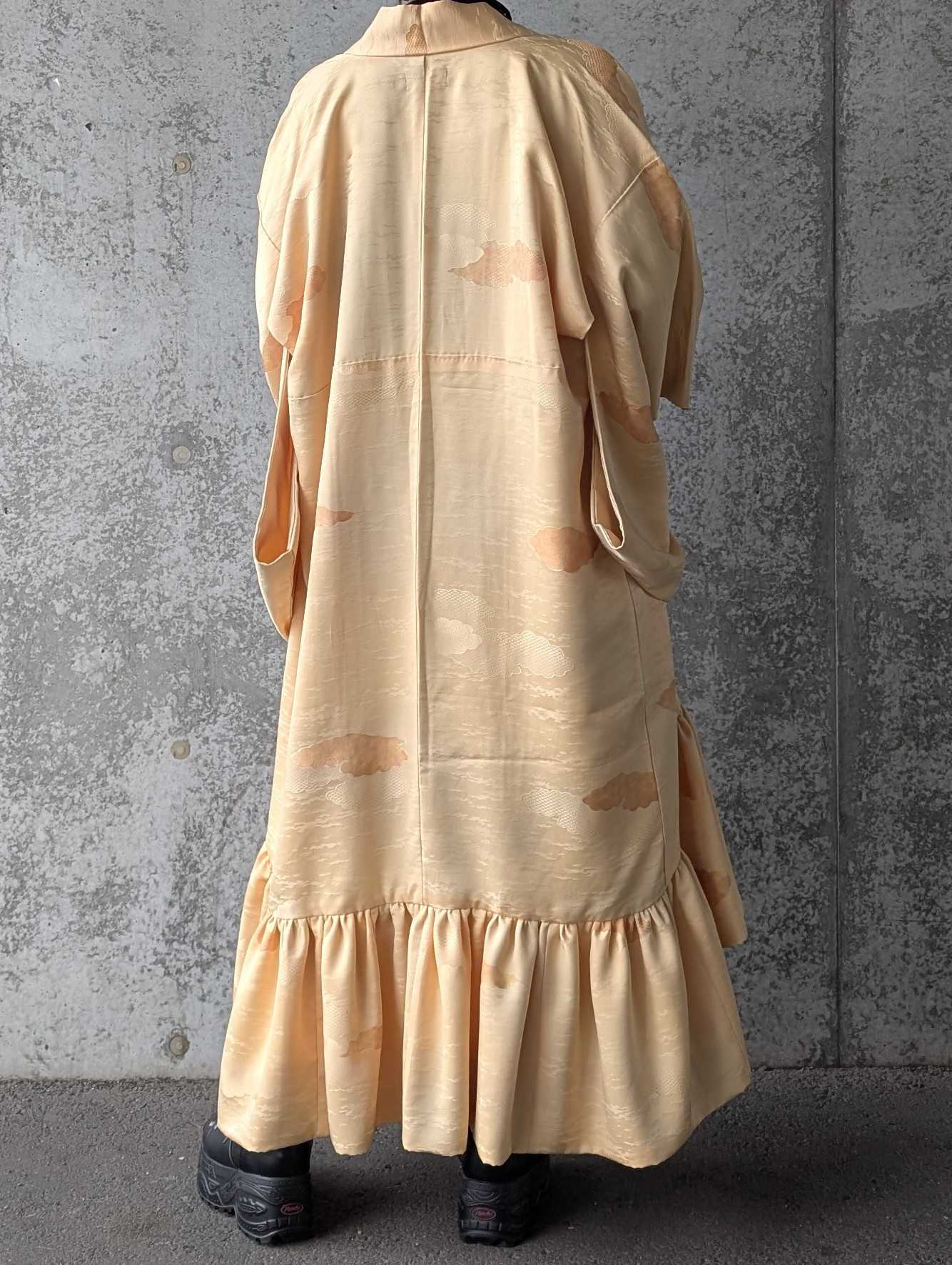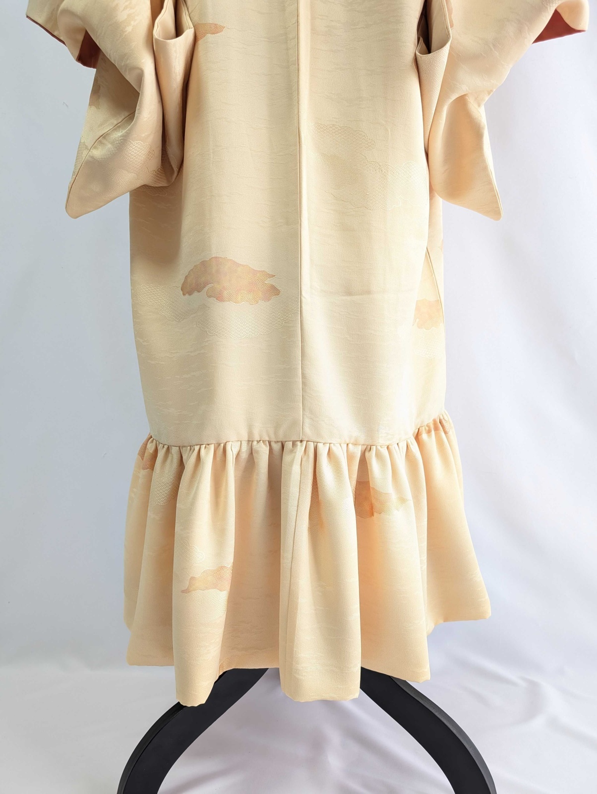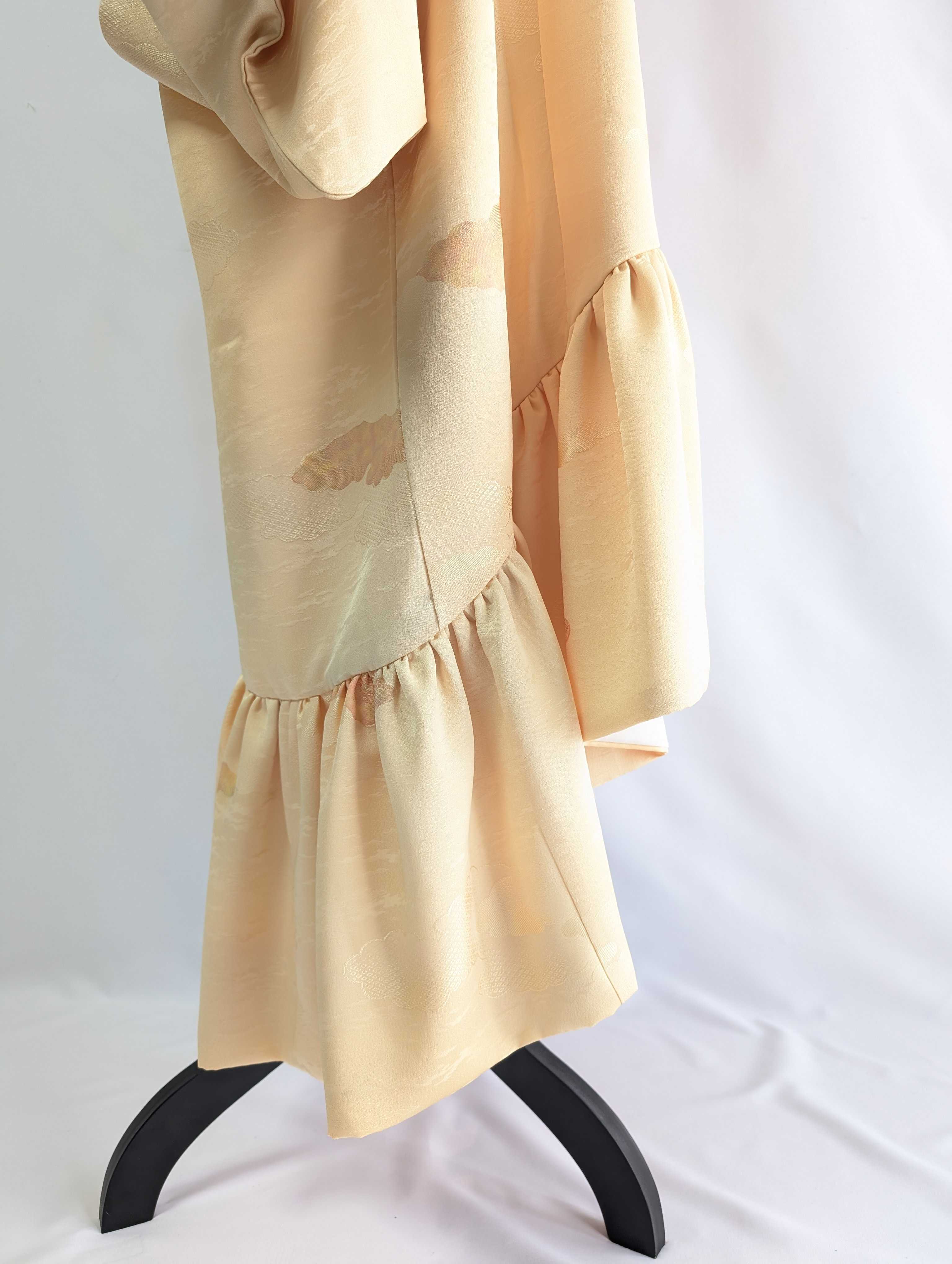 後ろ下がりのフリルラインは、歩くたびに軽やかなドレープを描き、動きのある表情を生み出します。