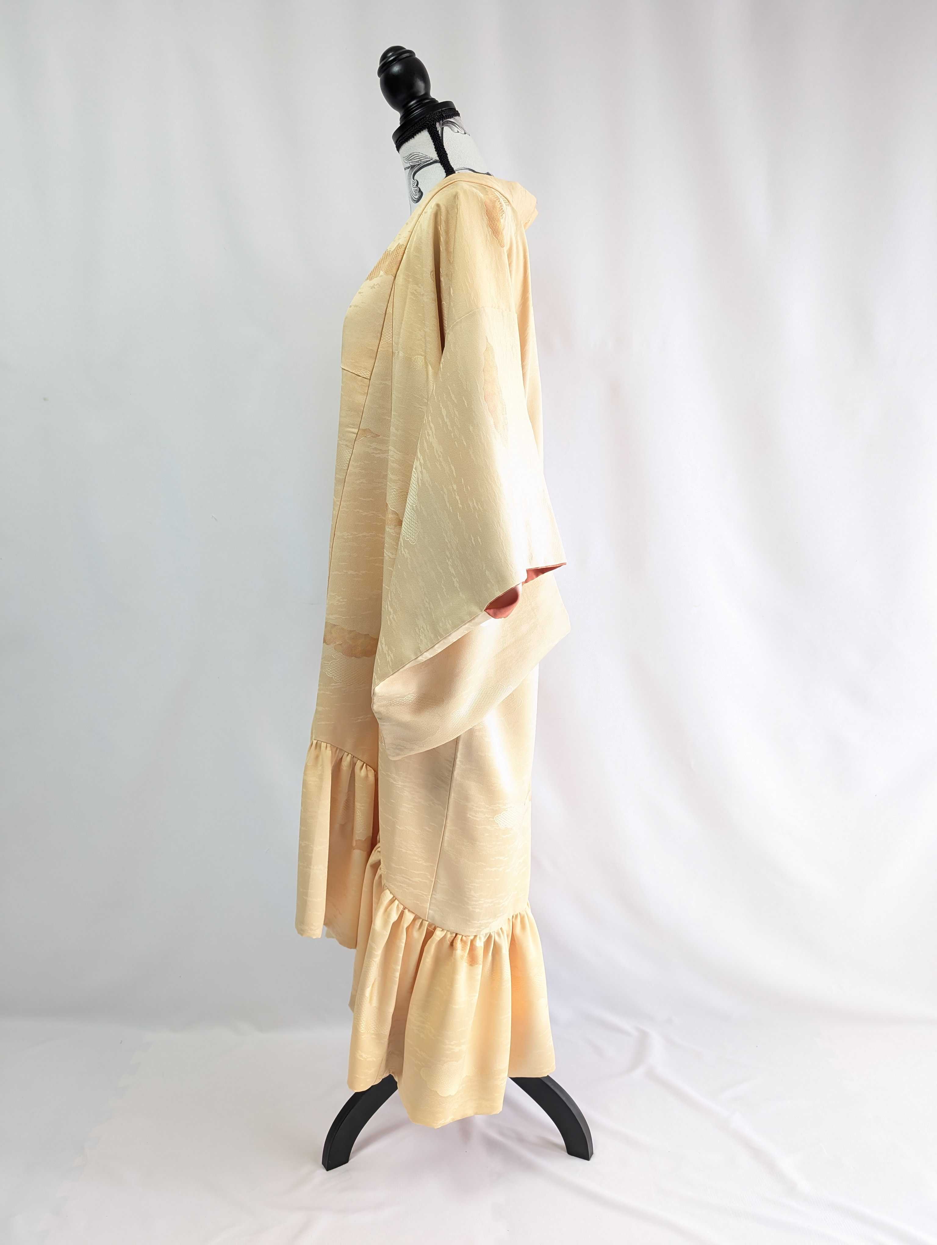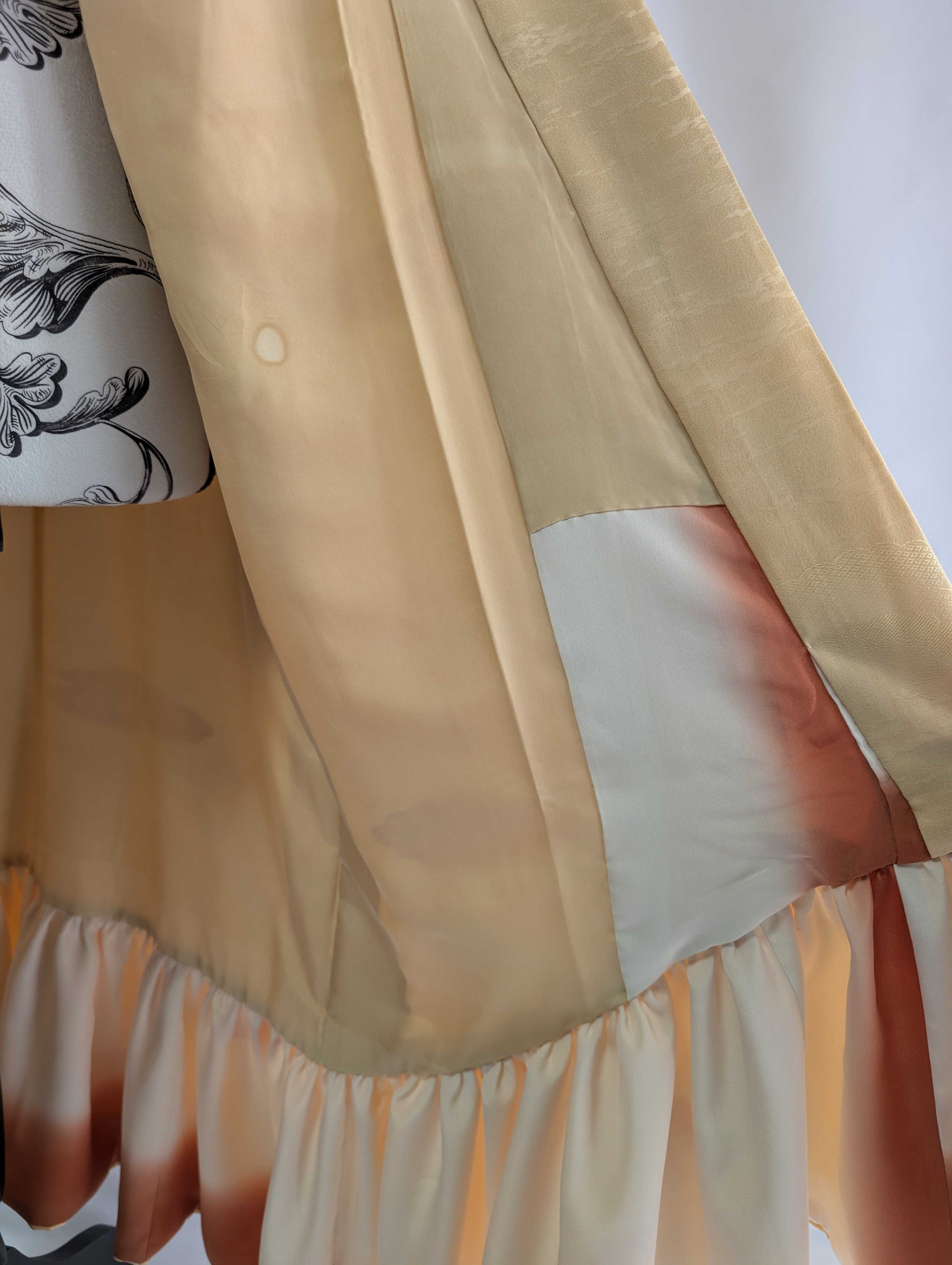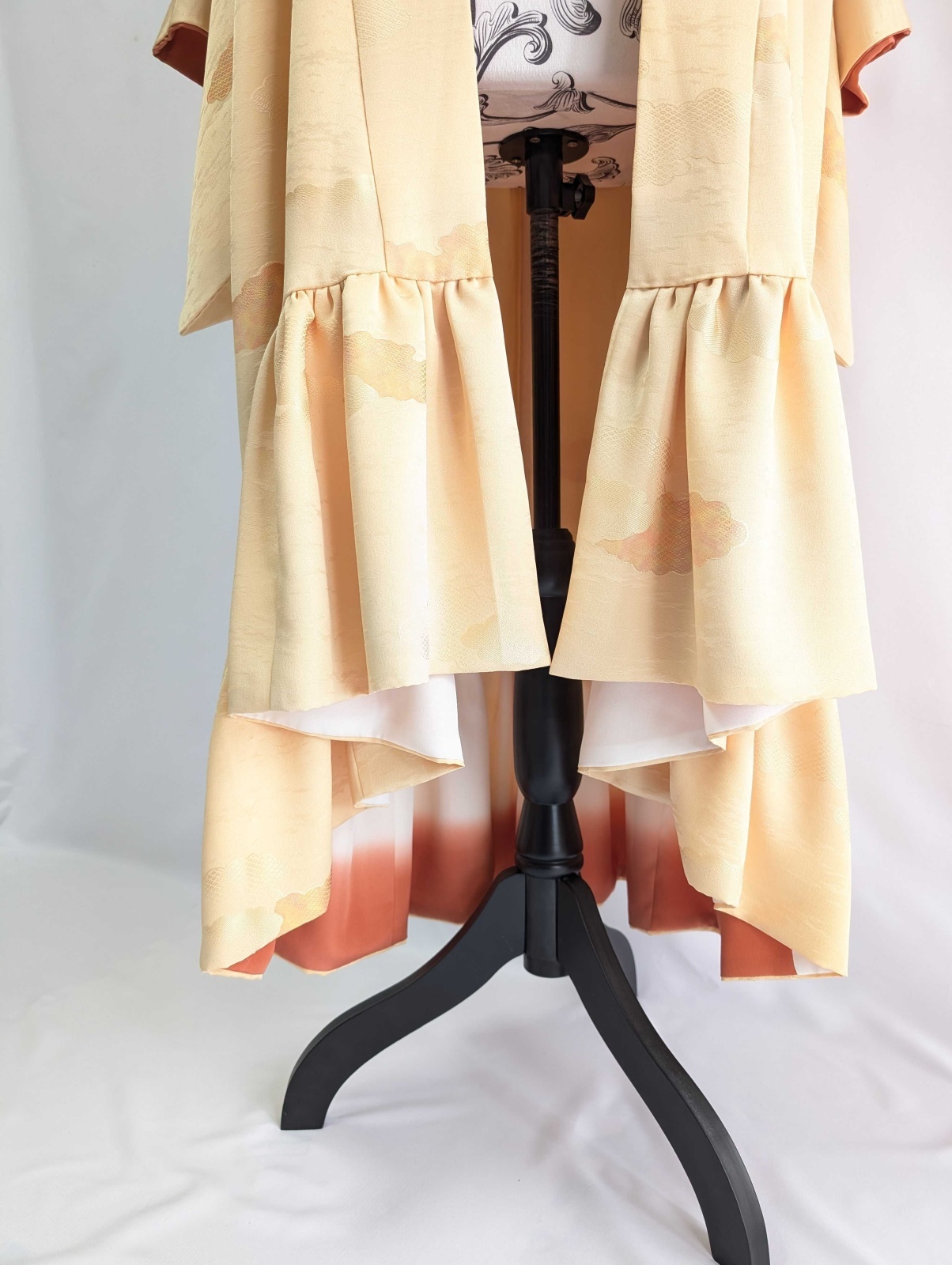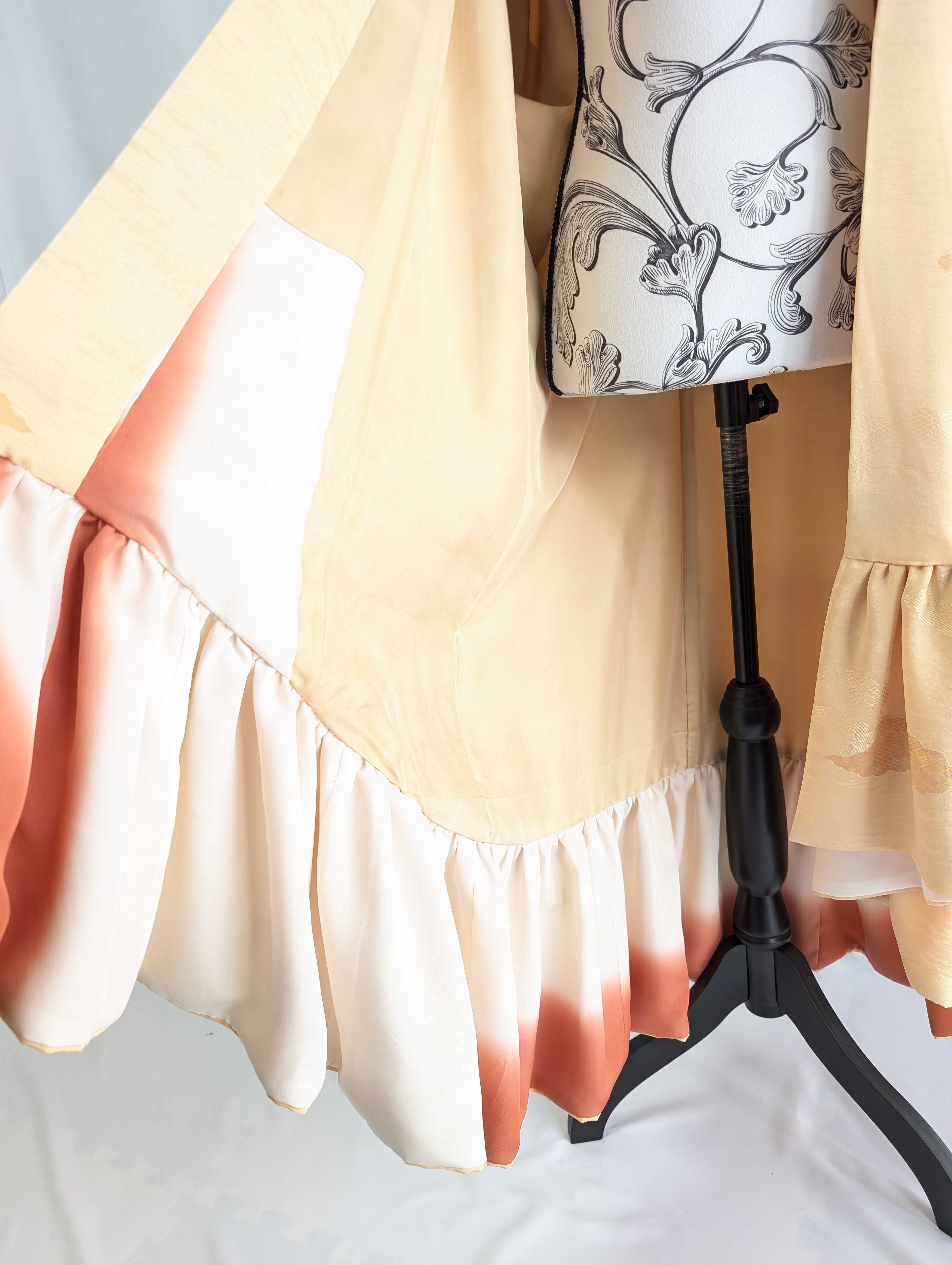 後ろ下がりのフリルラインは、歩くたびに軽やかなドレープを描き、動きのある表情を生み出します。
