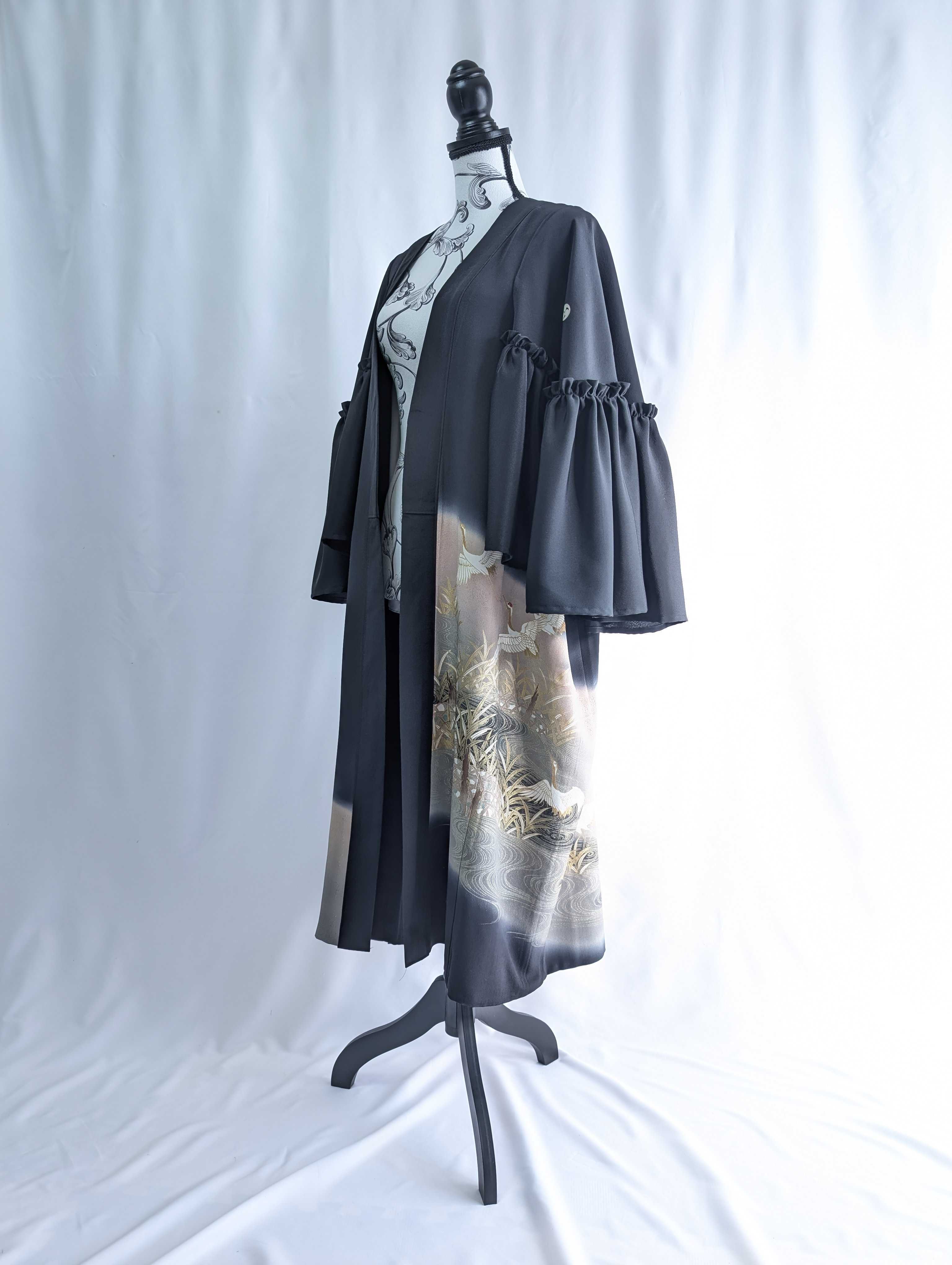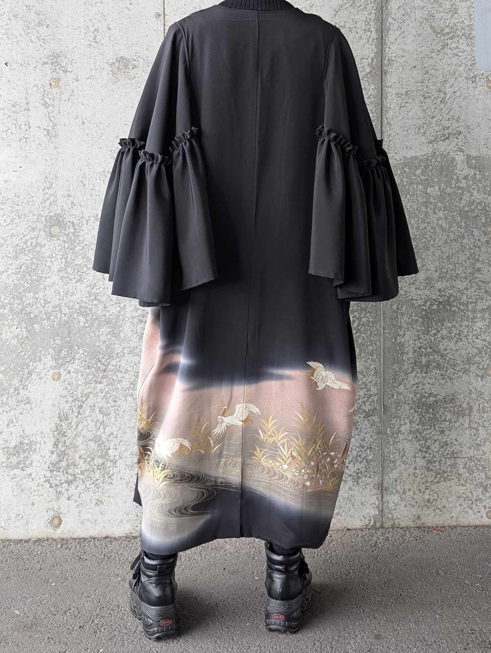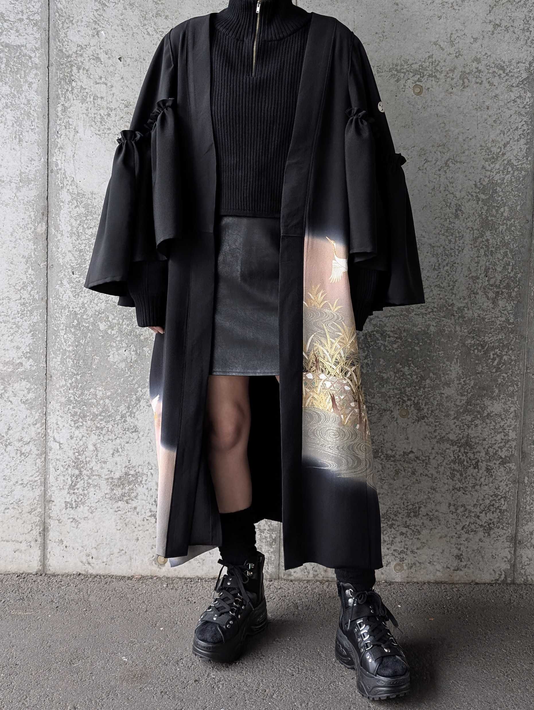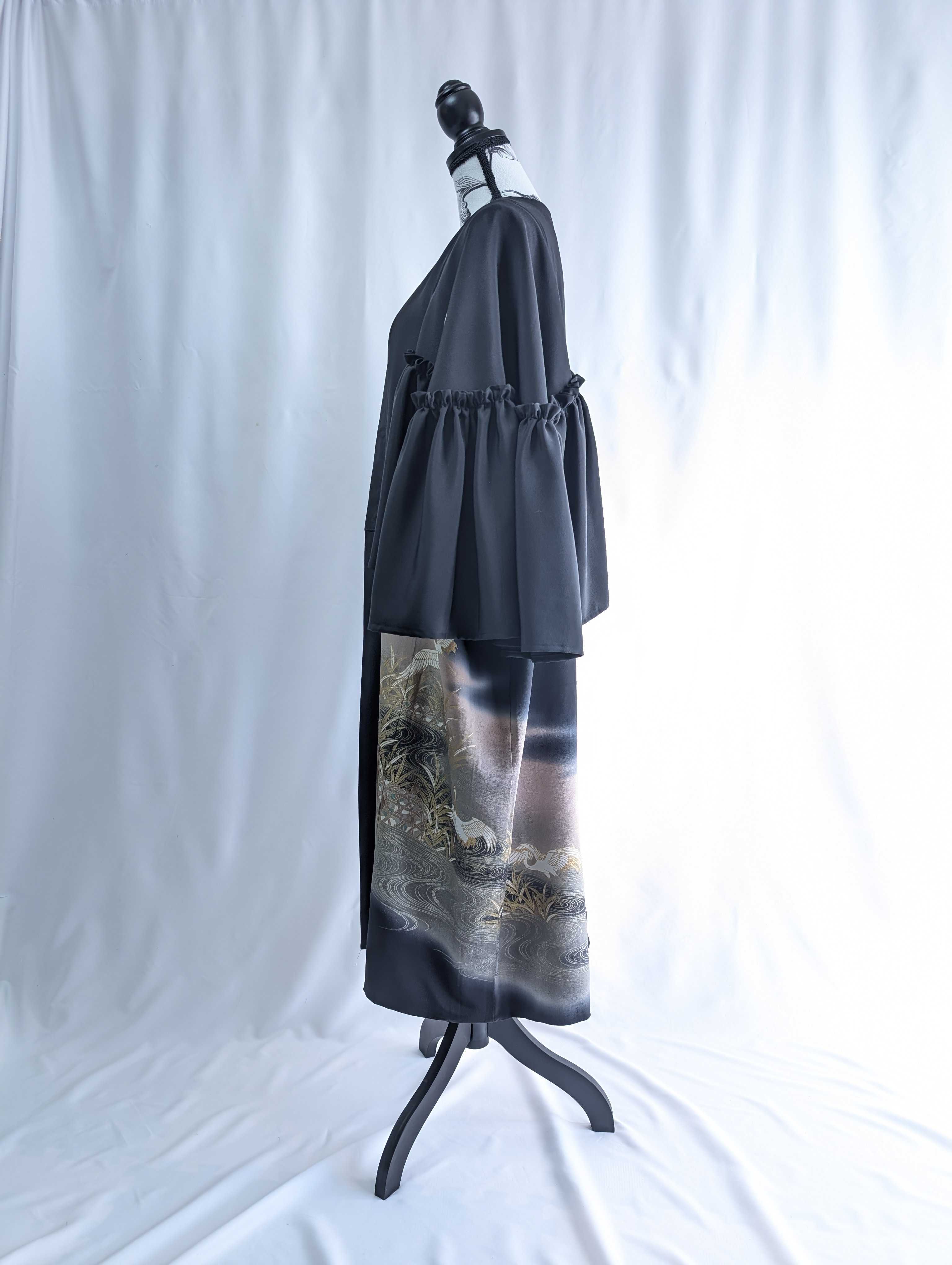 流水×飛鶴柄の黒留袖をリメイクしたフリルケープスリーブカーディガンコート。
