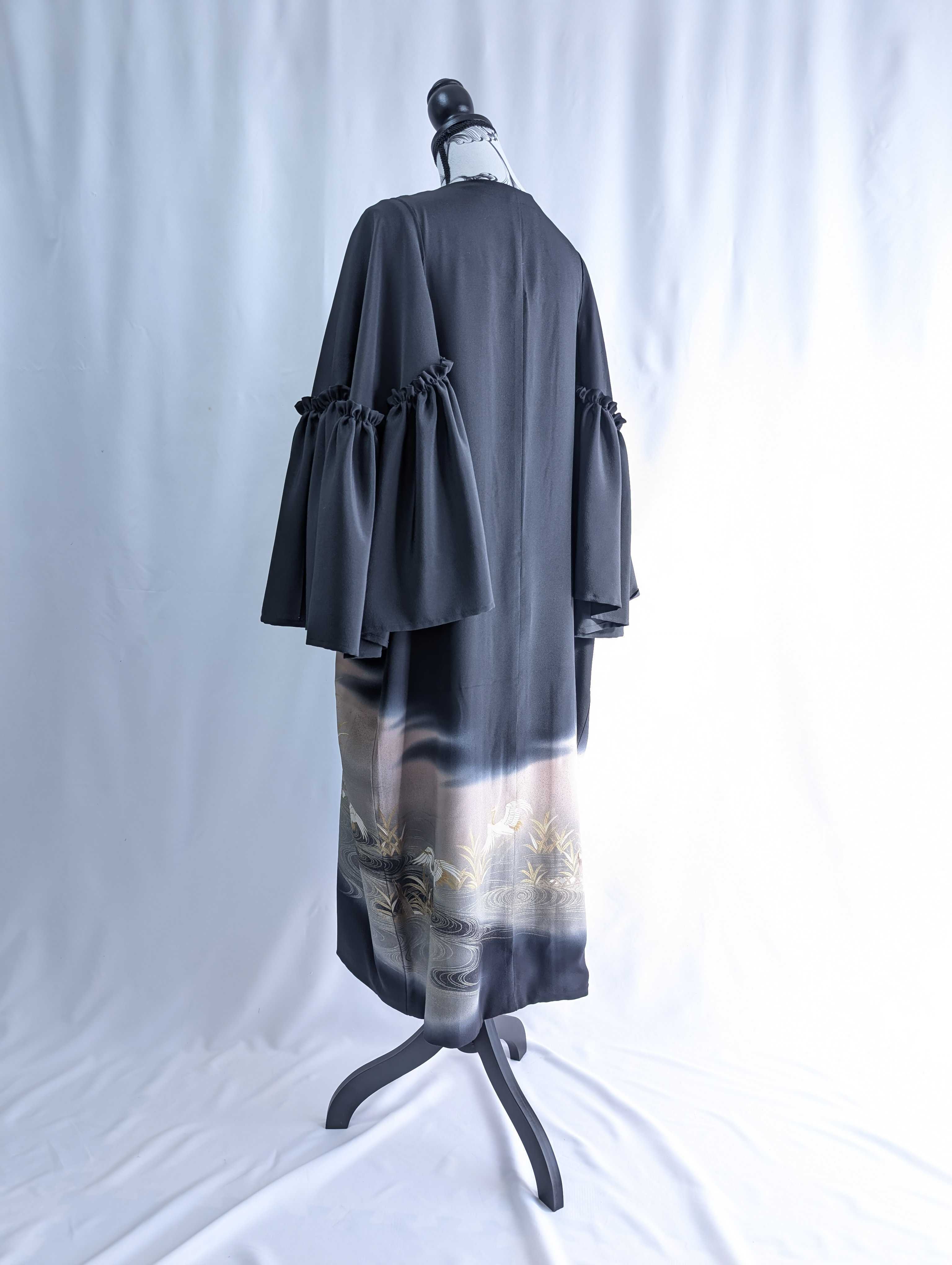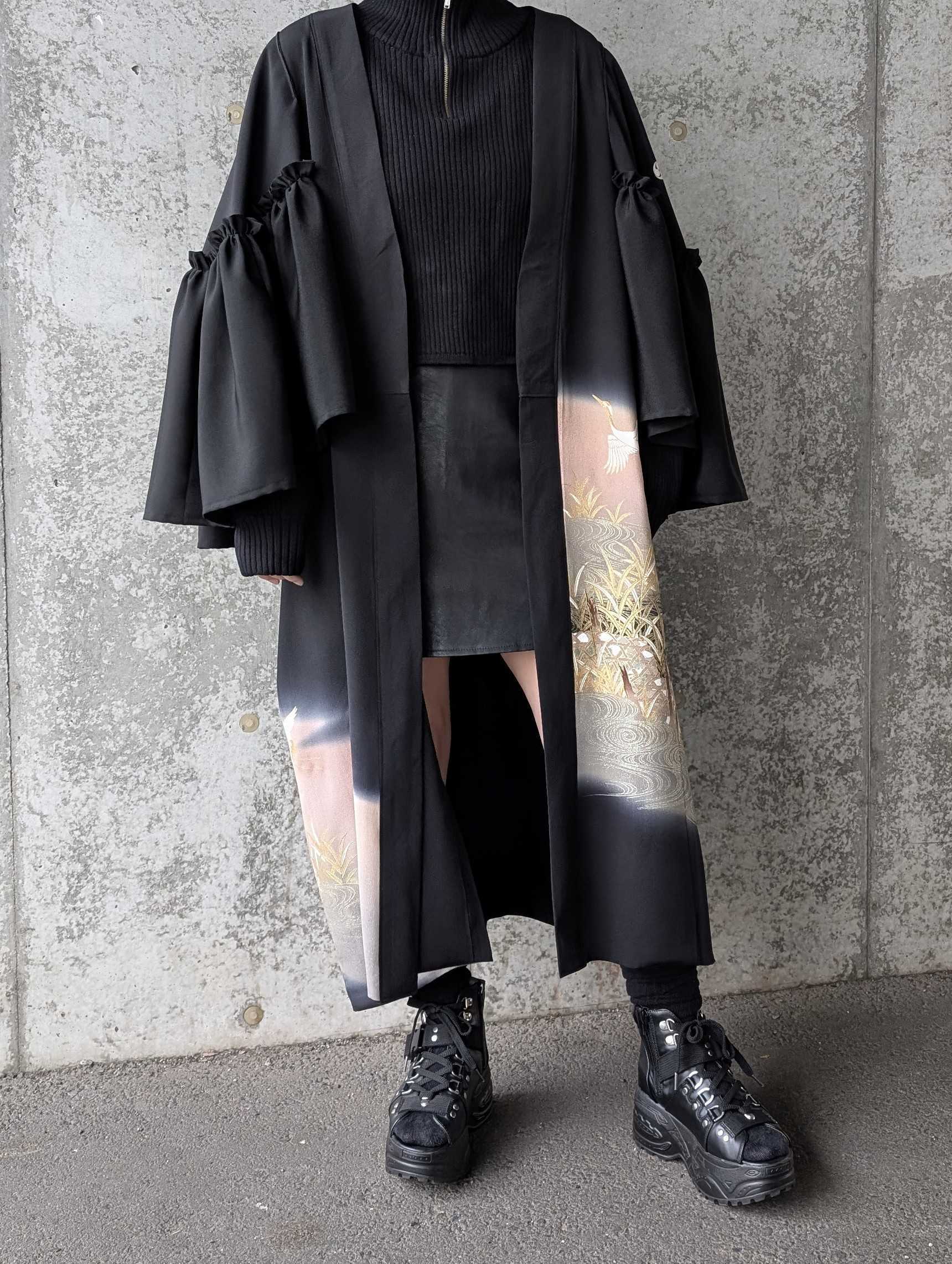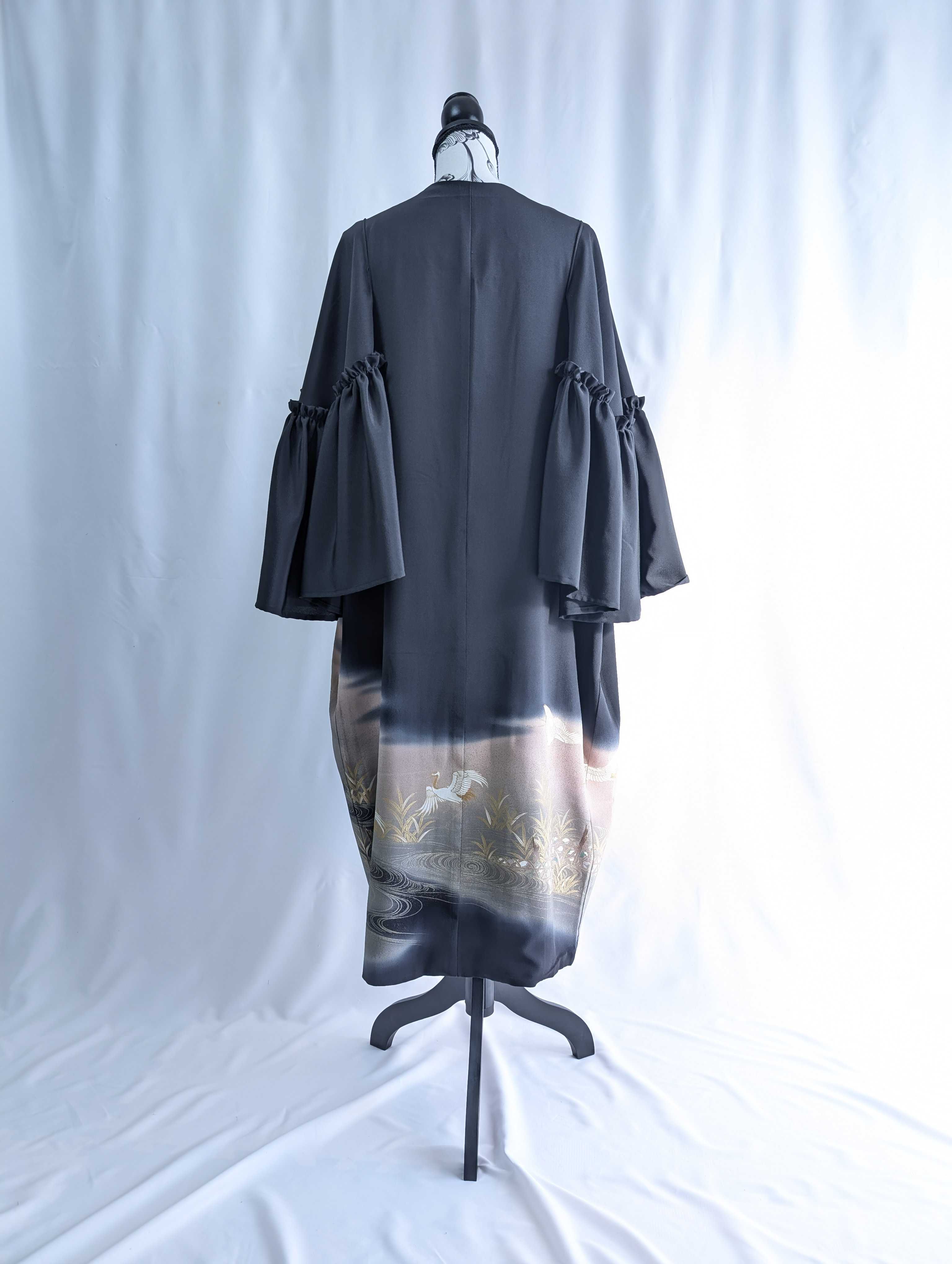 流水×飛鶴柄の黒留袖をリメイクしたフリルケープスリーブカーディガンコート。