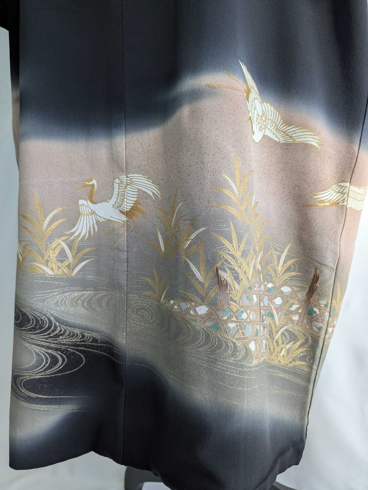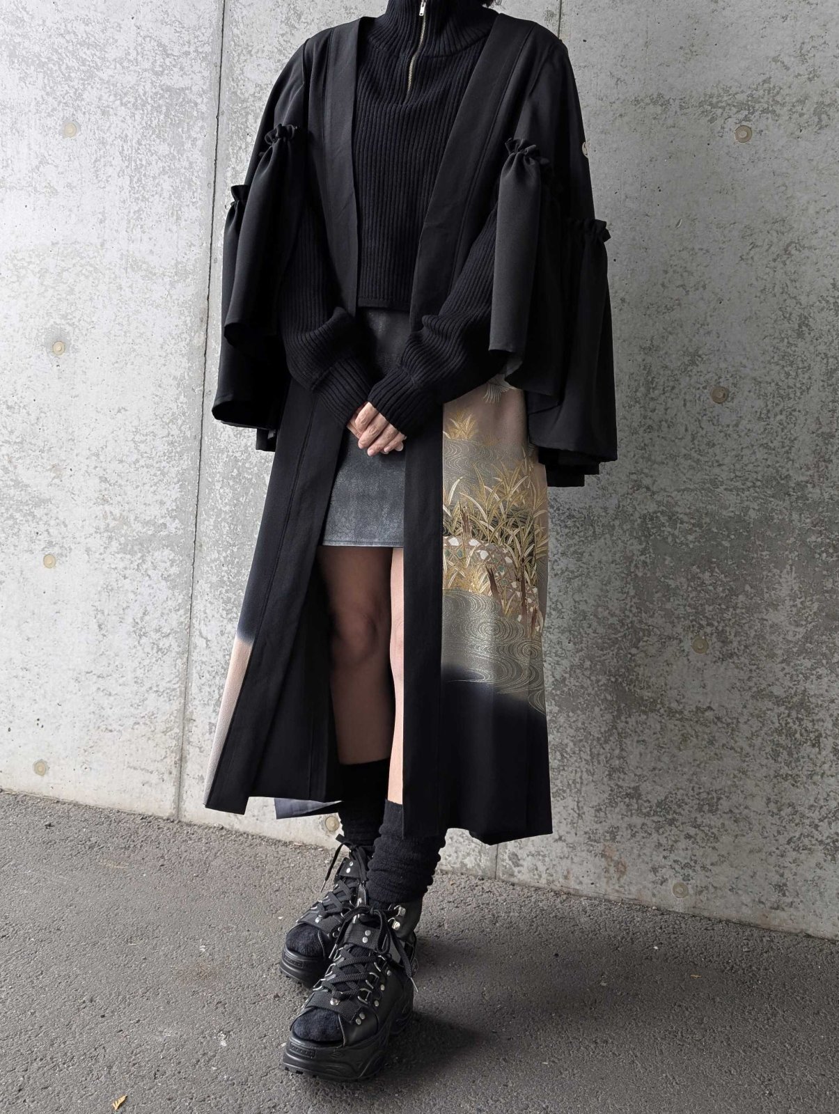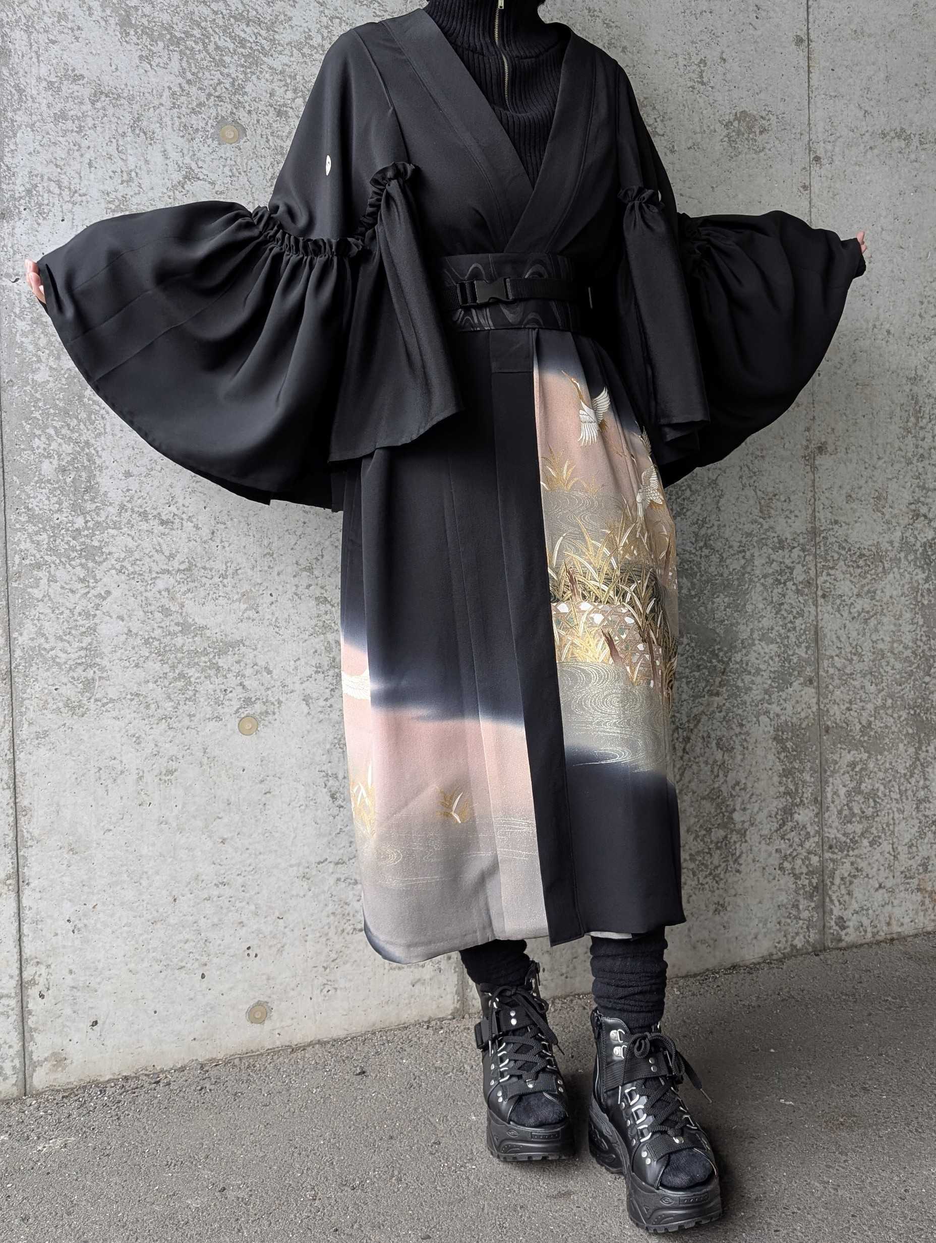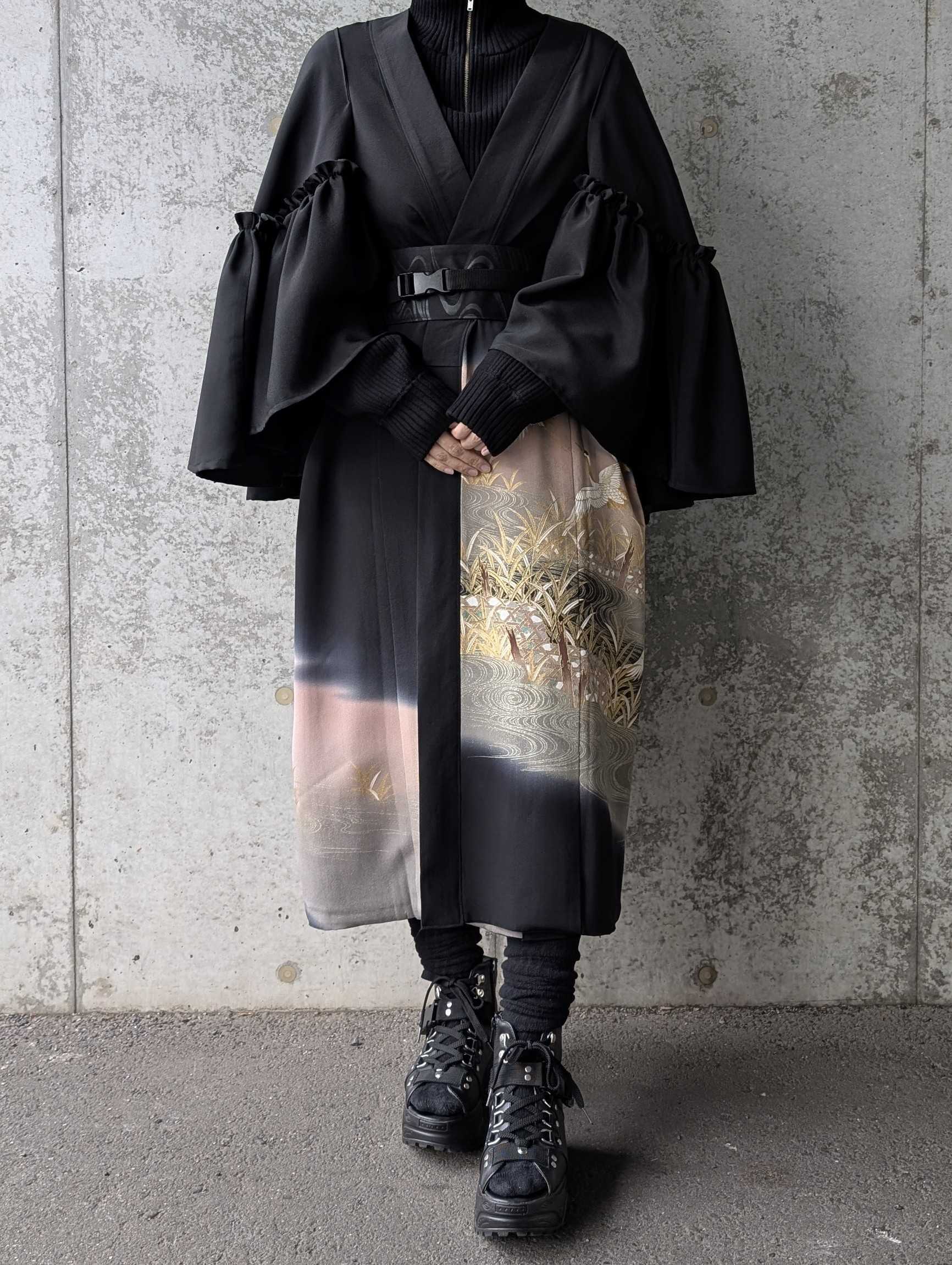 流水×飛鶴柄の黒留袖をリメイクしたフリルケープスリーブカーディガンコート。