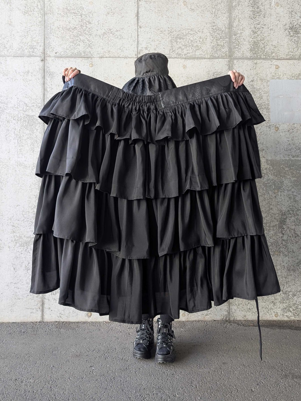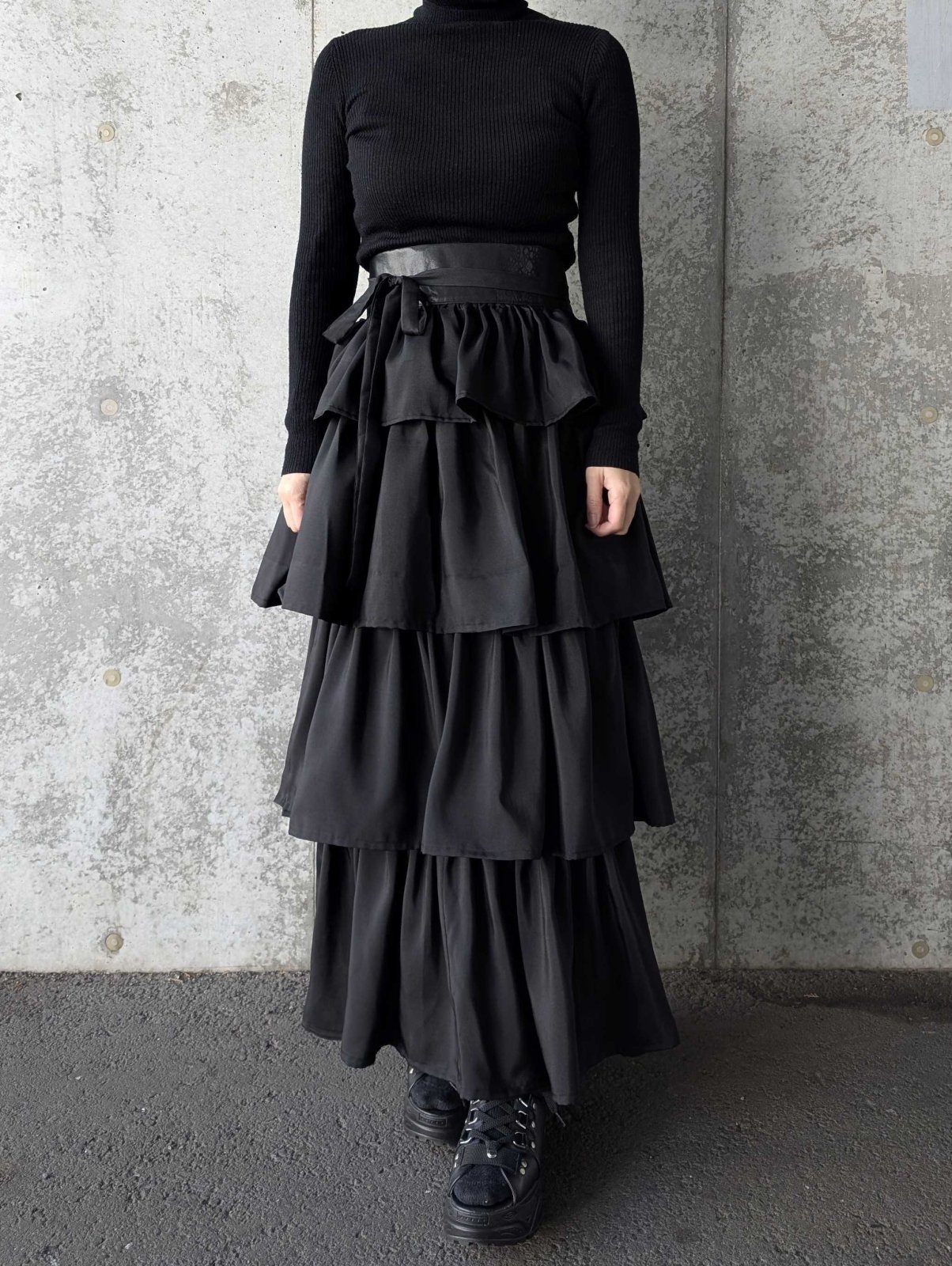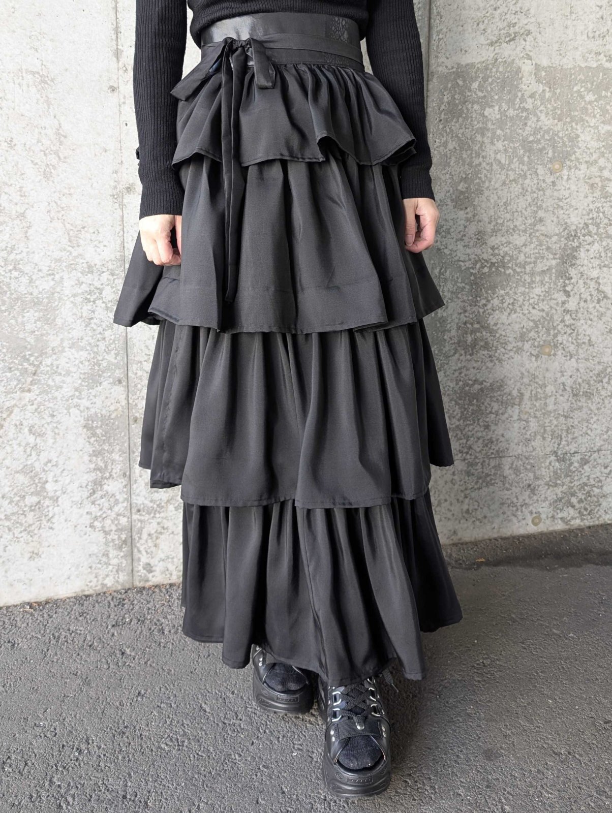 ラップティアードスカートは、4段のフリルになっており可愛さもありつつ、モードな印象。