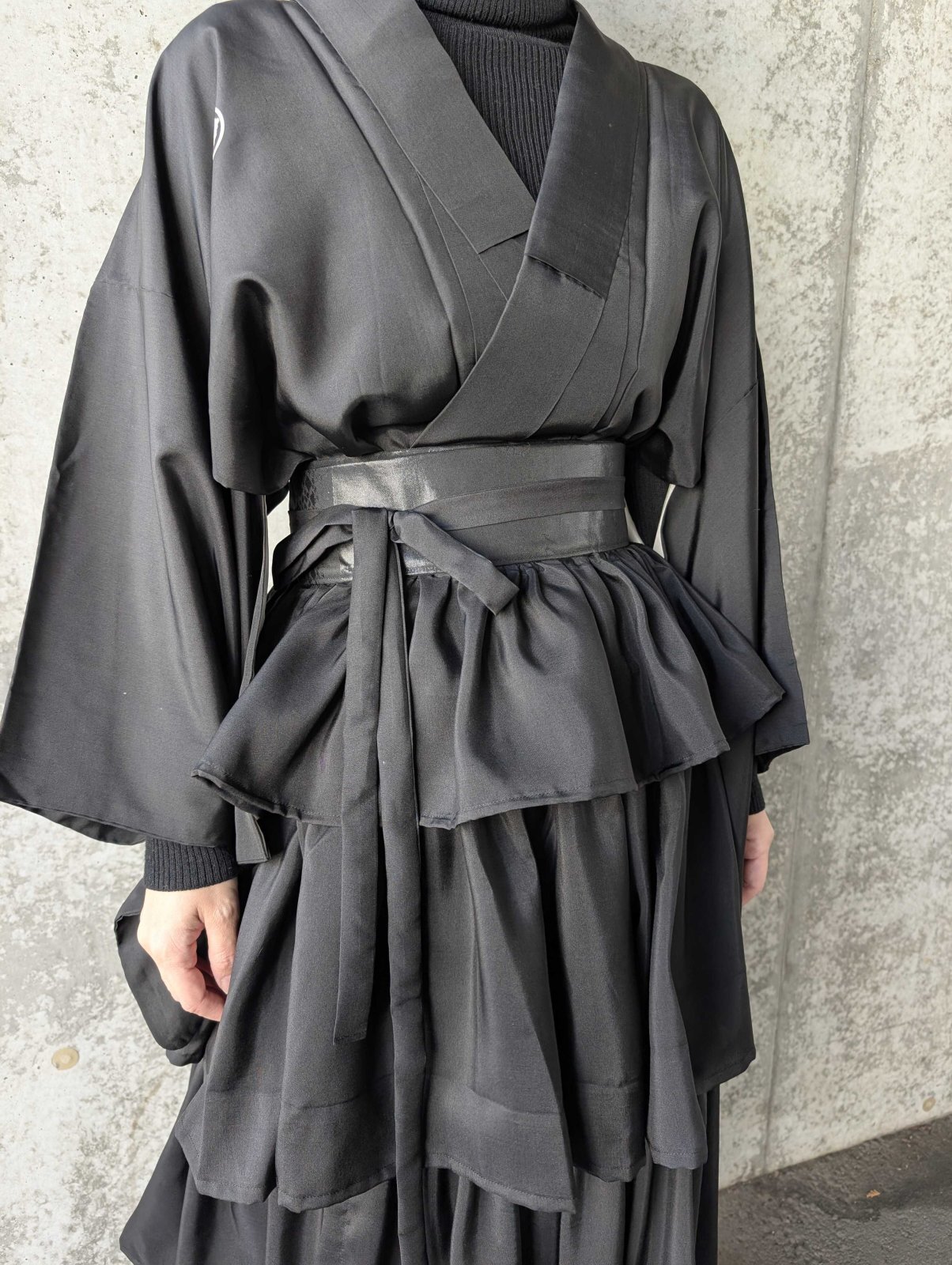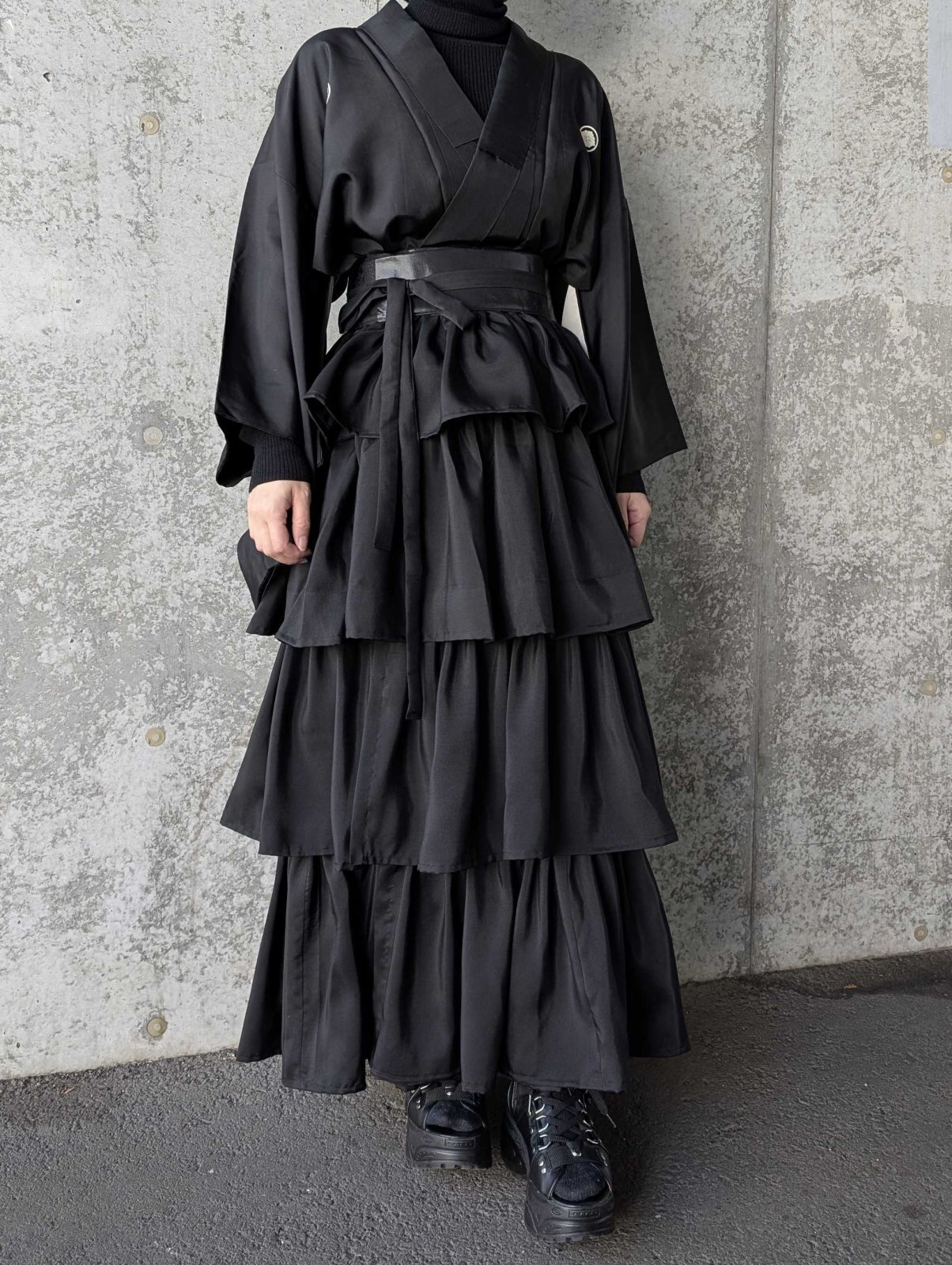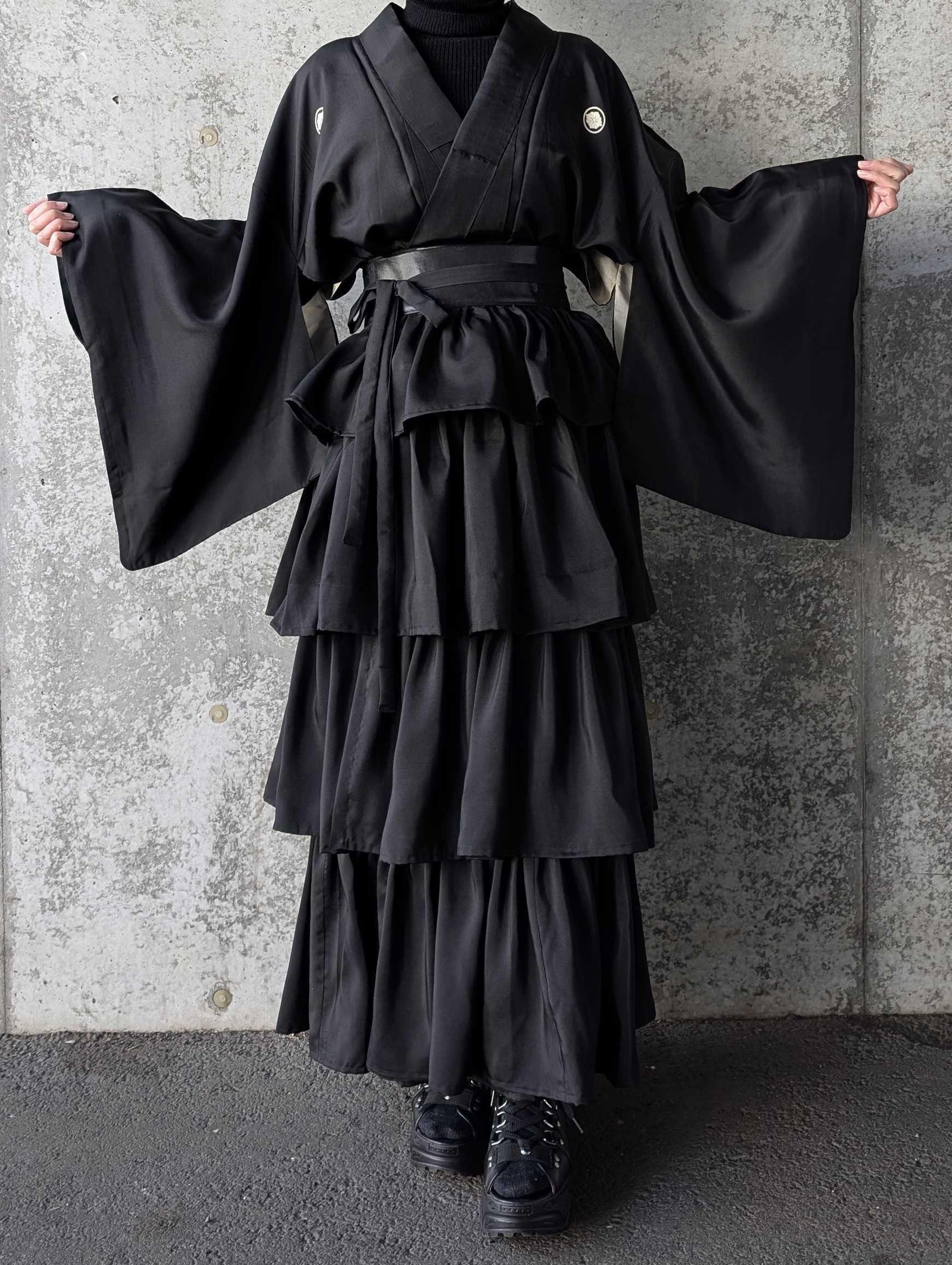 黒紋付をリメイクしたフリルラップスカートとジャケットのセットアップ。