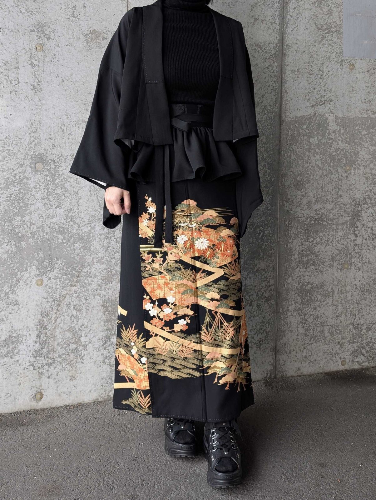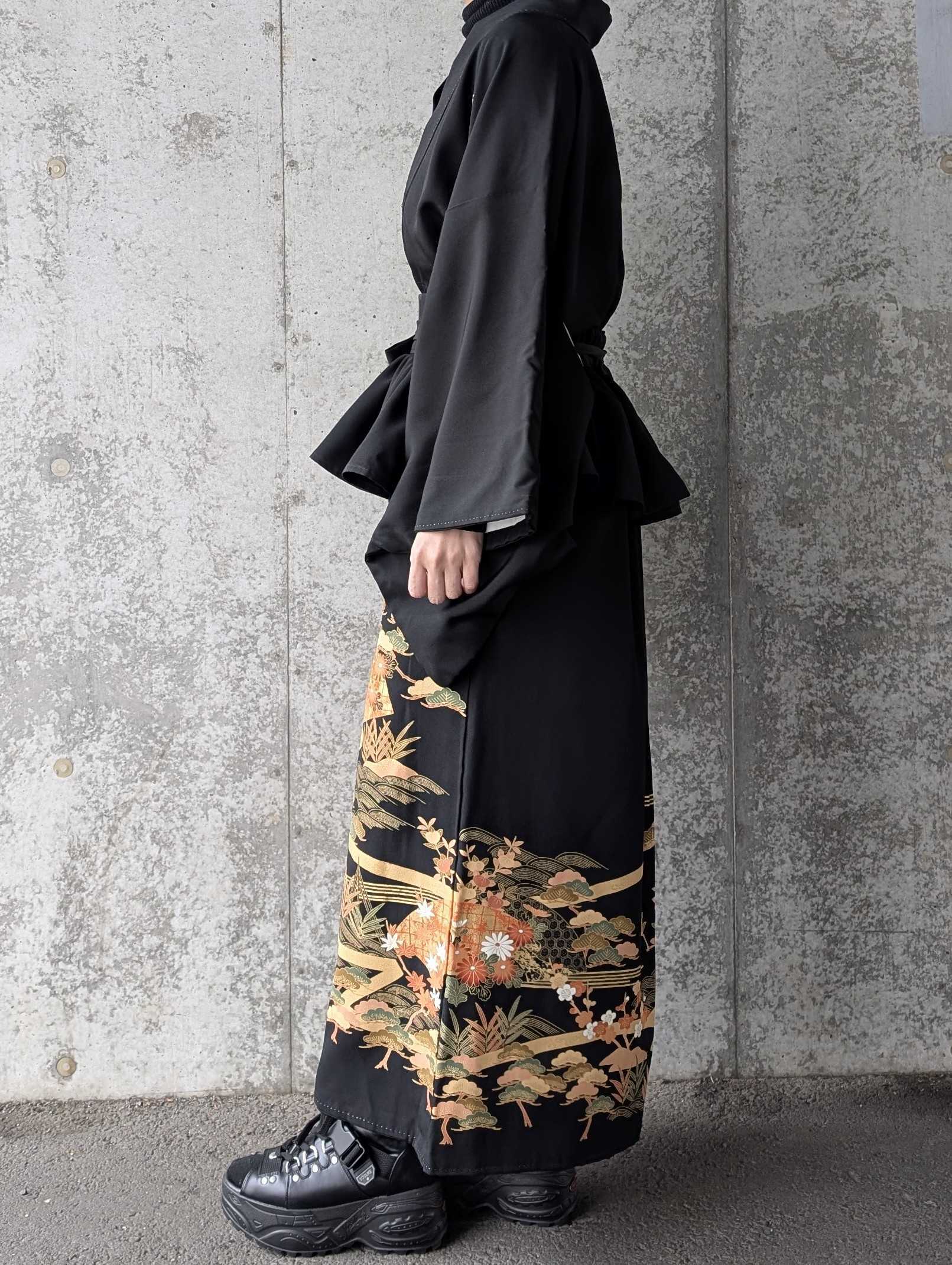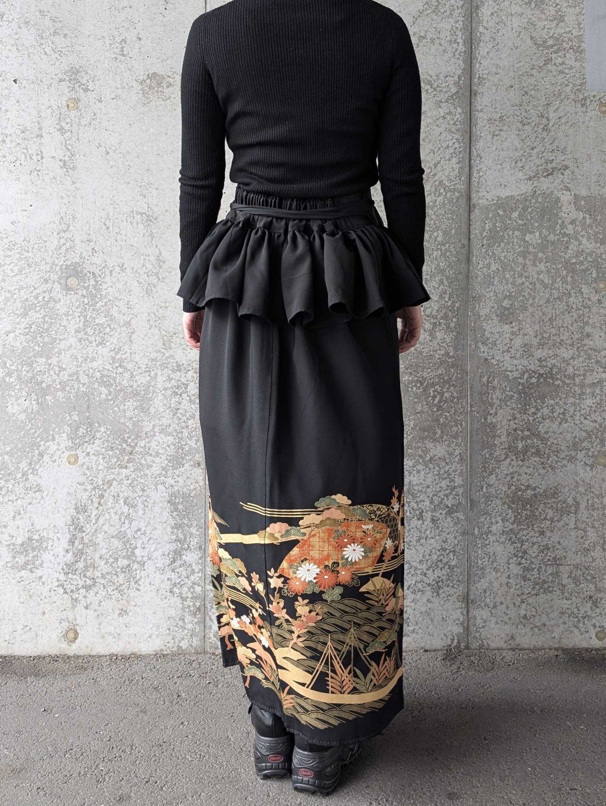 金駒×四季草花の黒留袖をリメイクしたフリルラップスカートのセットアップ。