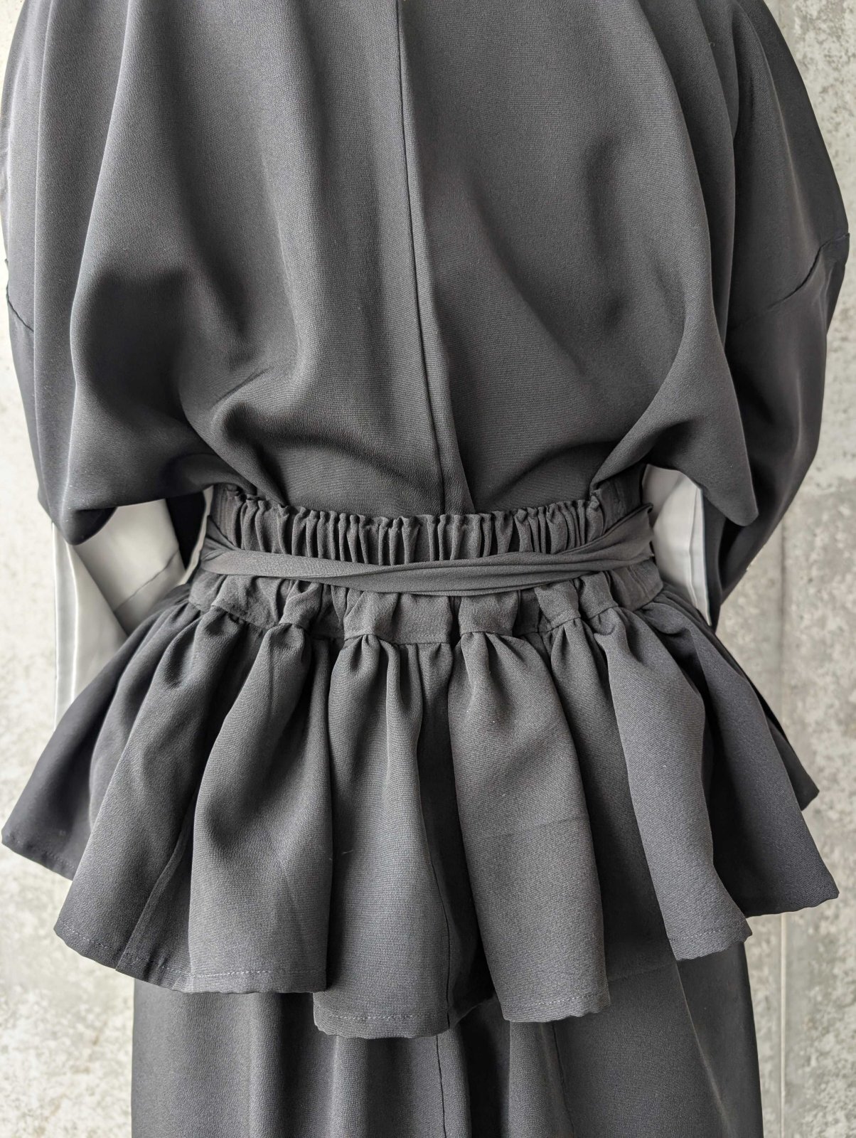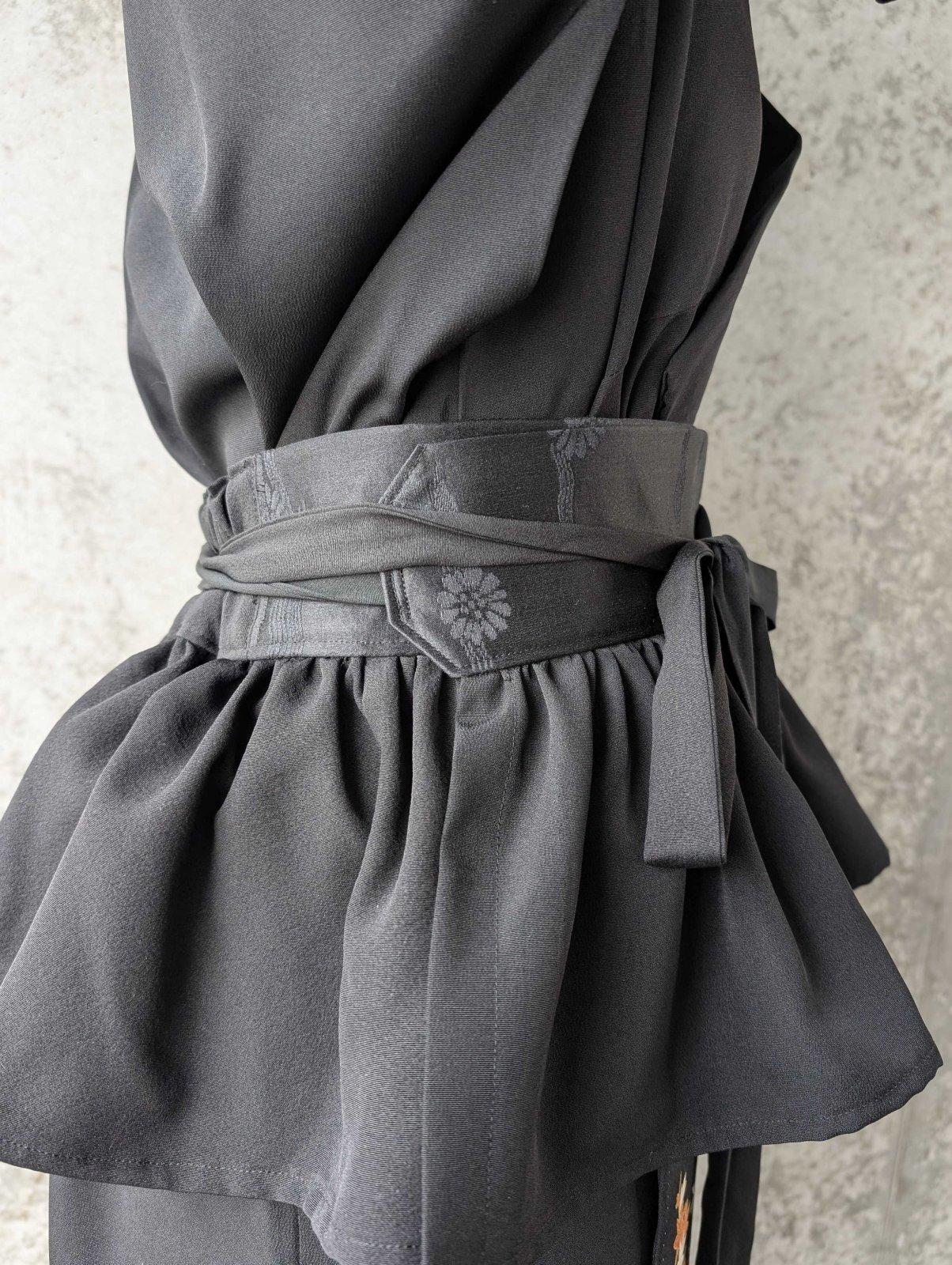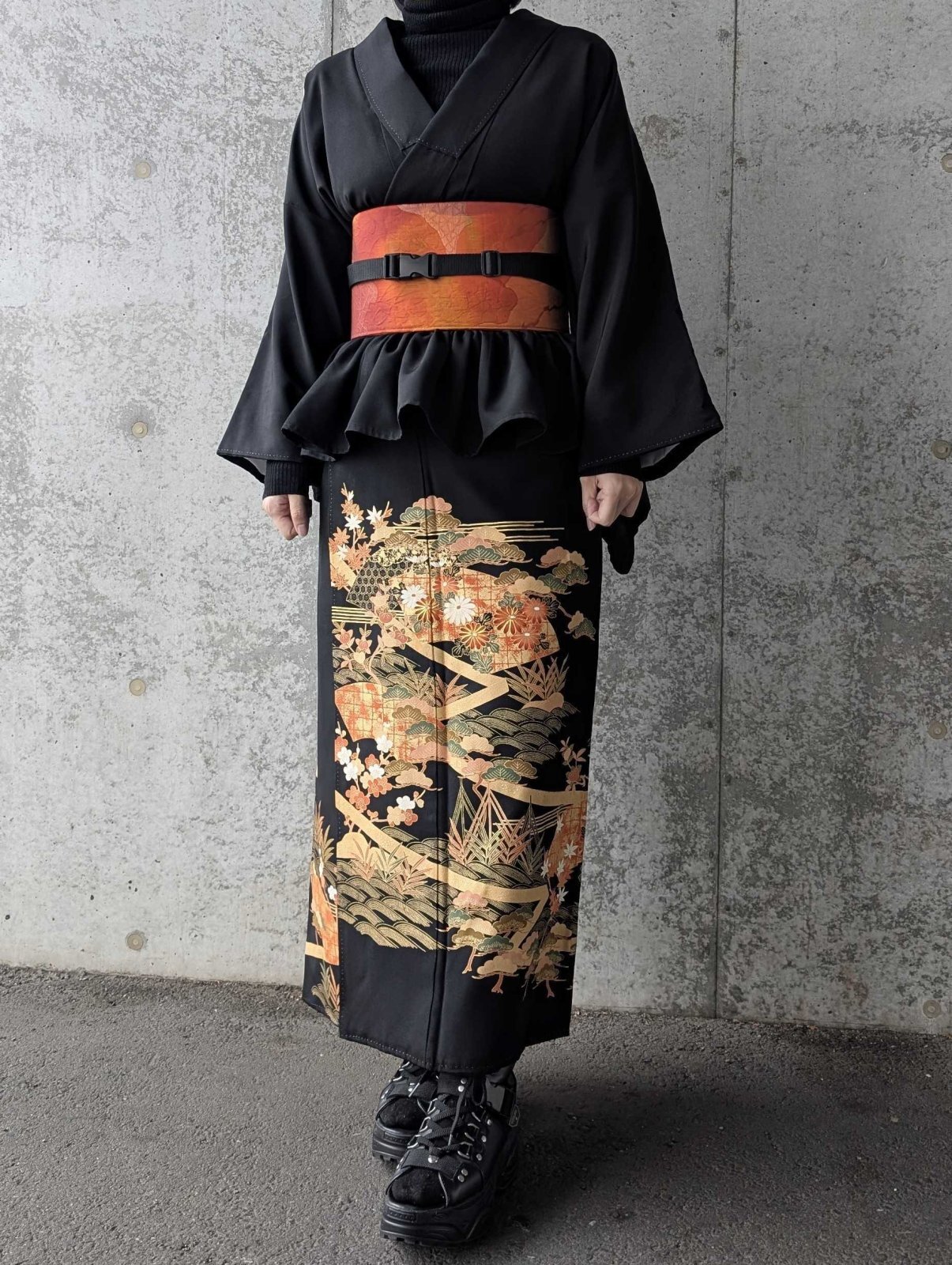 金駒×四季草花の黒留袖をリメイクしたフリルラップスカートのセットアップ。