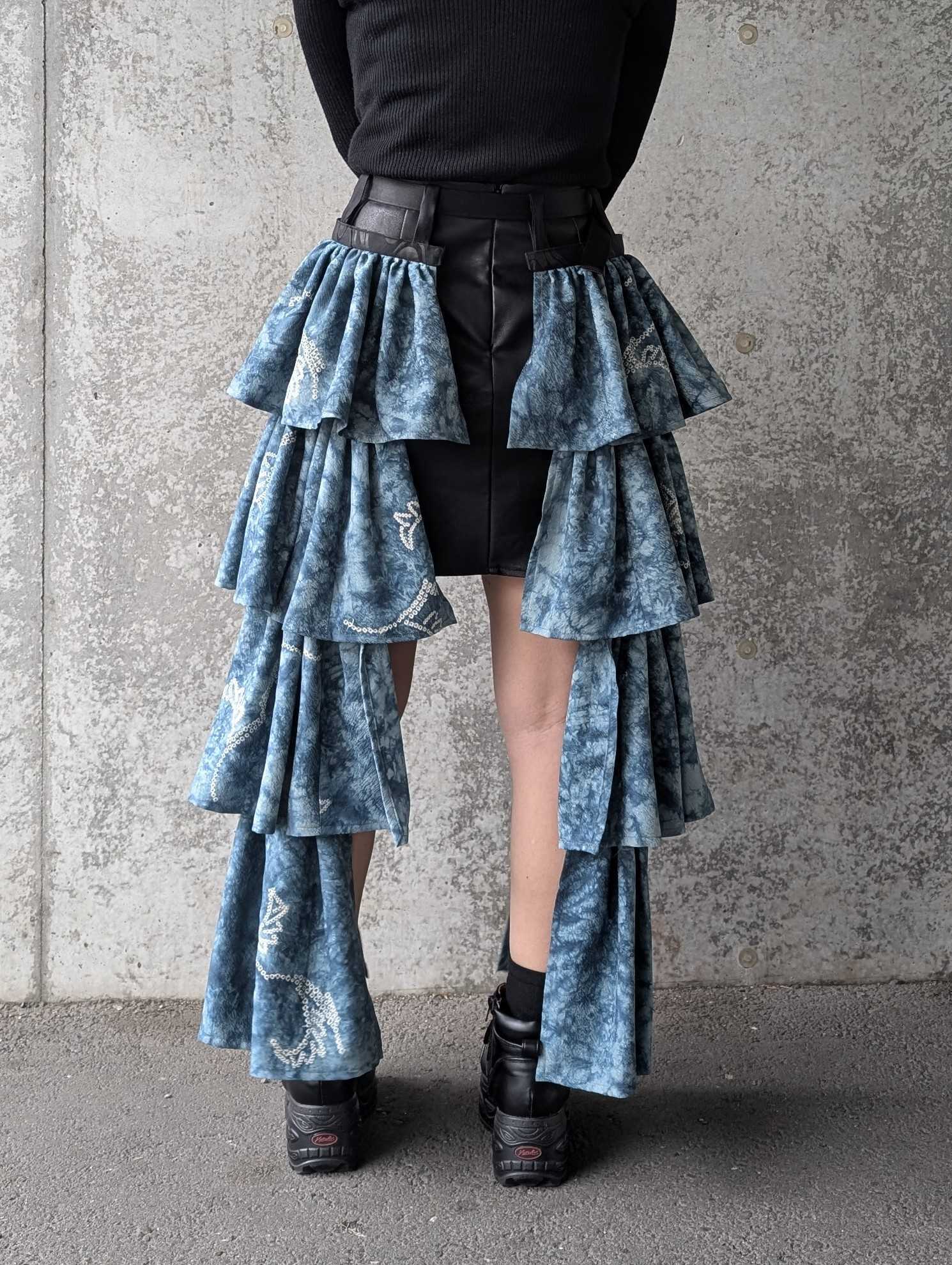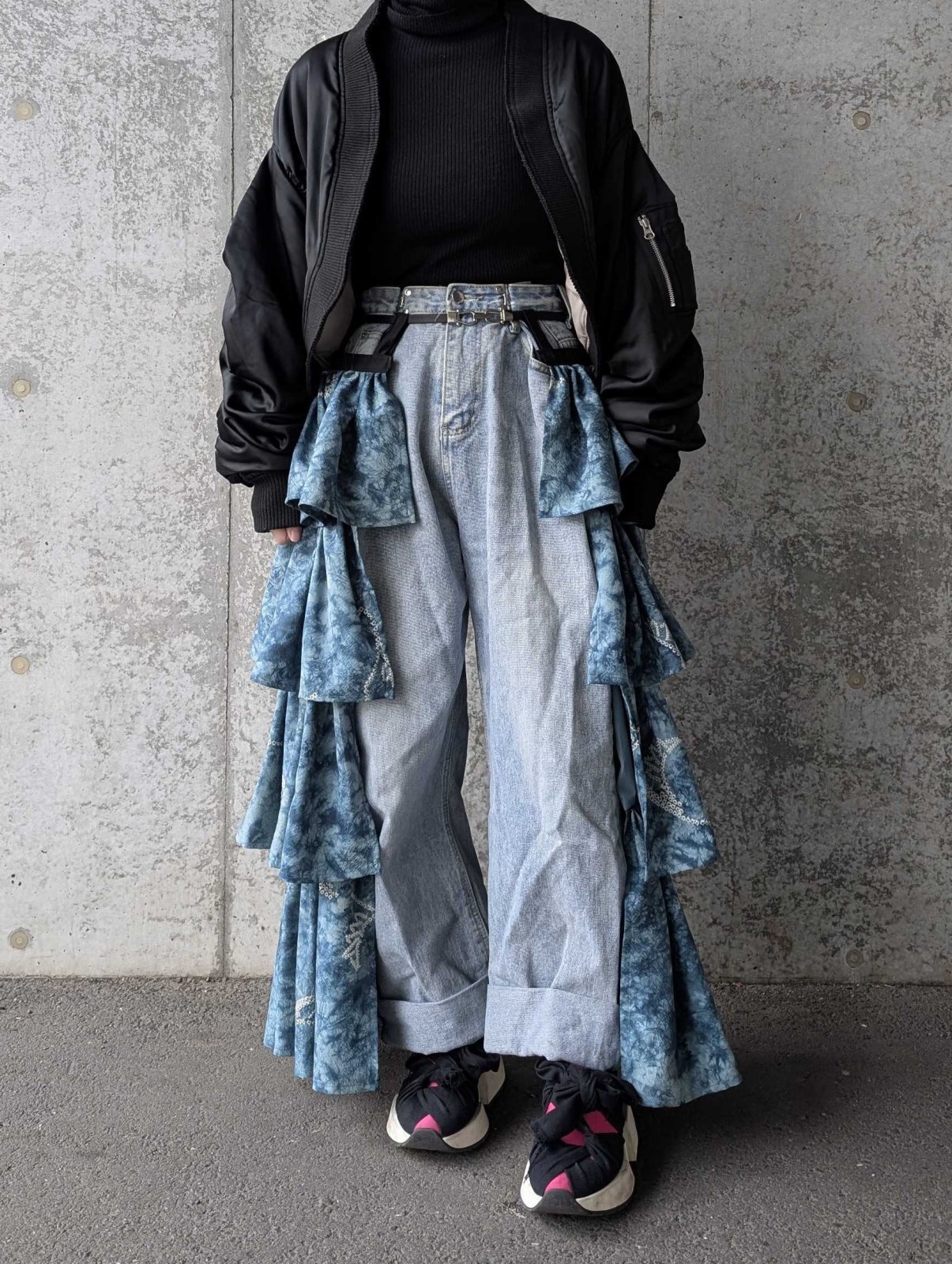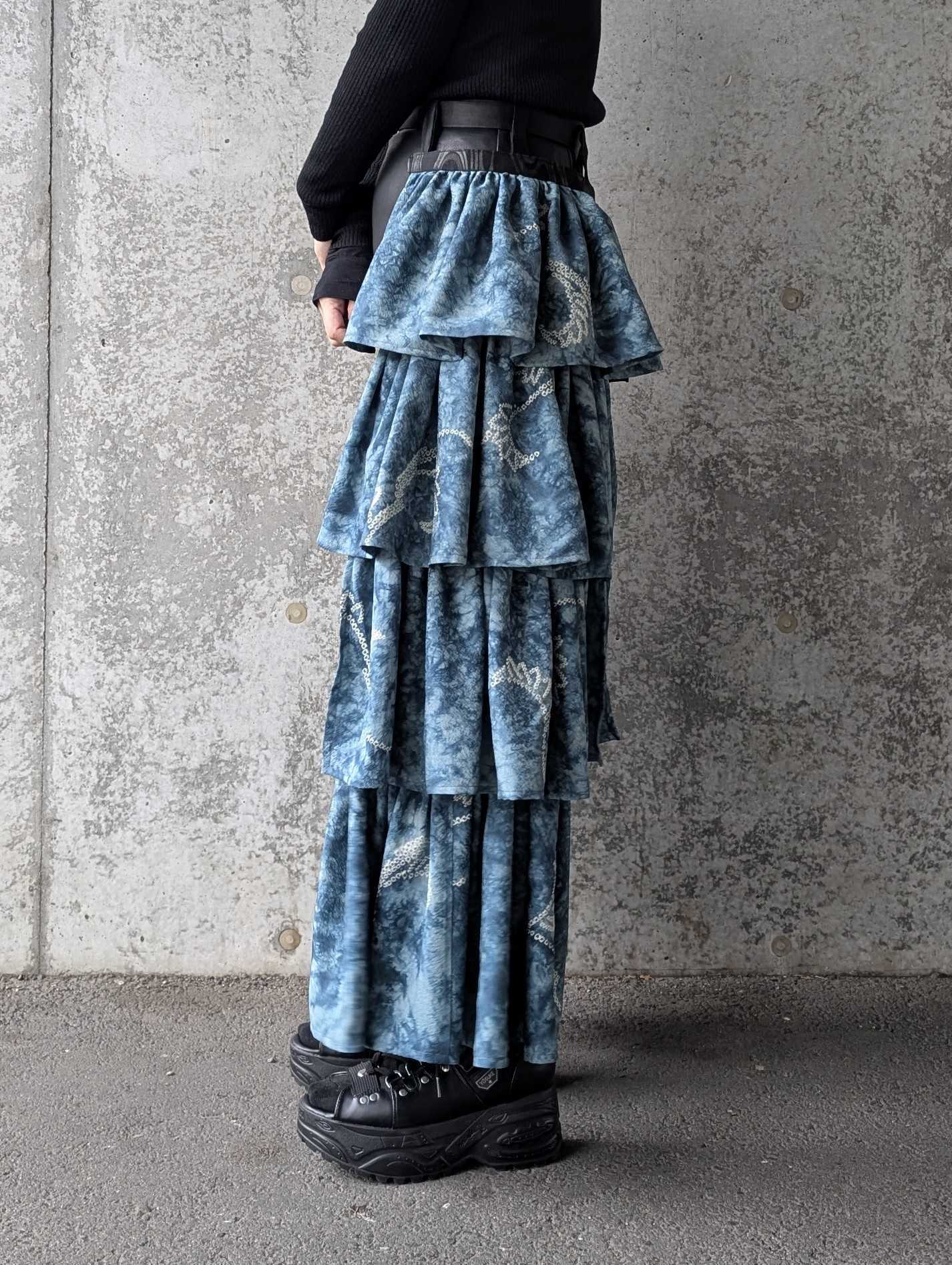 4段に重ねられたティアードフリルが、ボトムスに重厚なボリュームと構造的な動きを付与します。