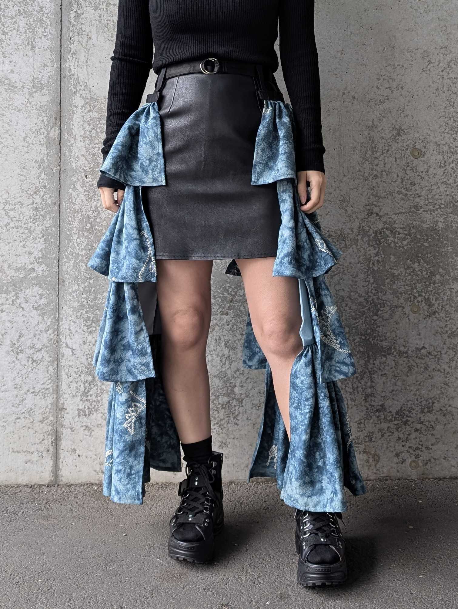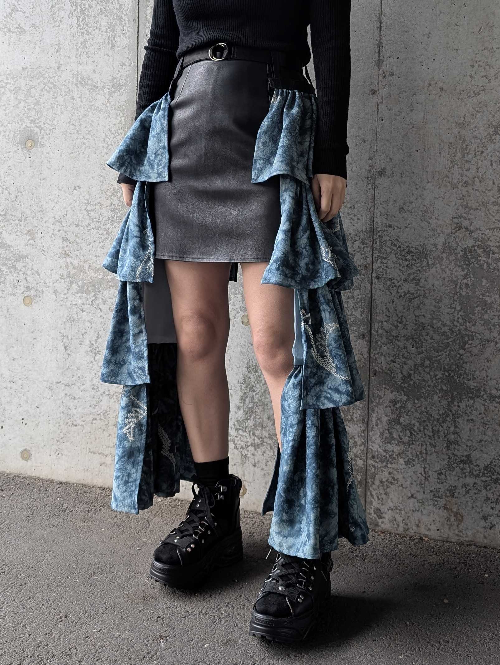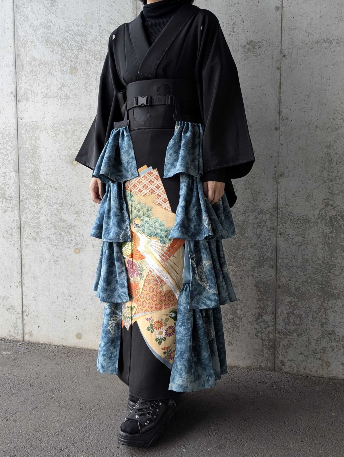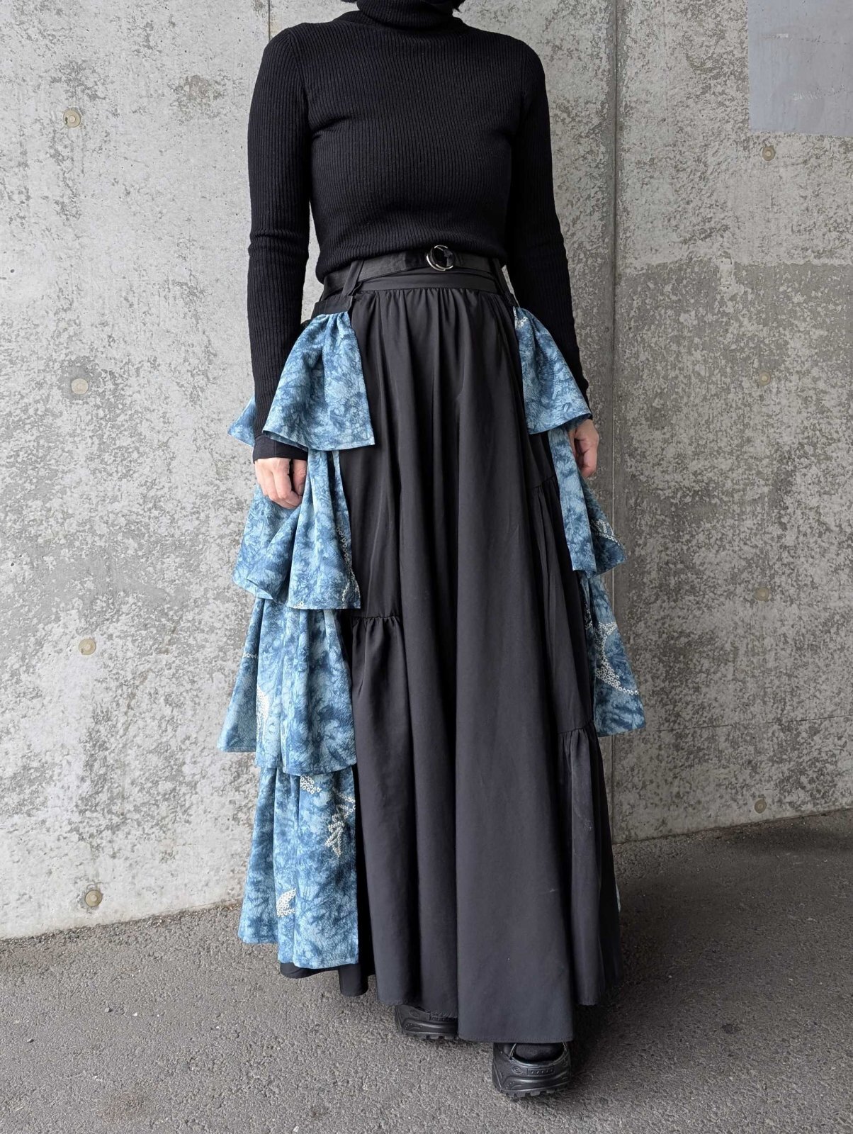 4段に重ねられたティアードフリルが、ボトムスに重厚なボリュームと構造的な動きを付与します。