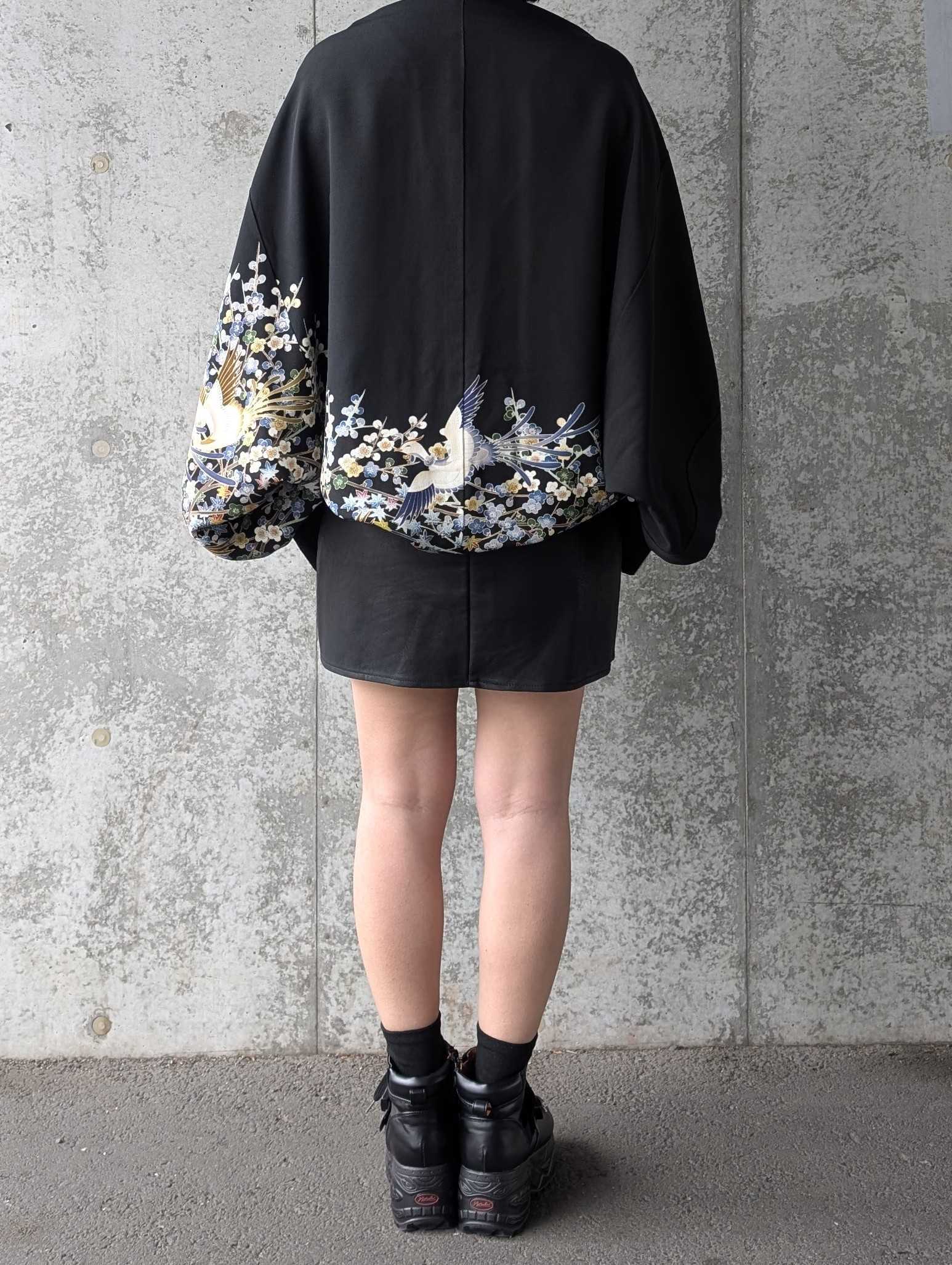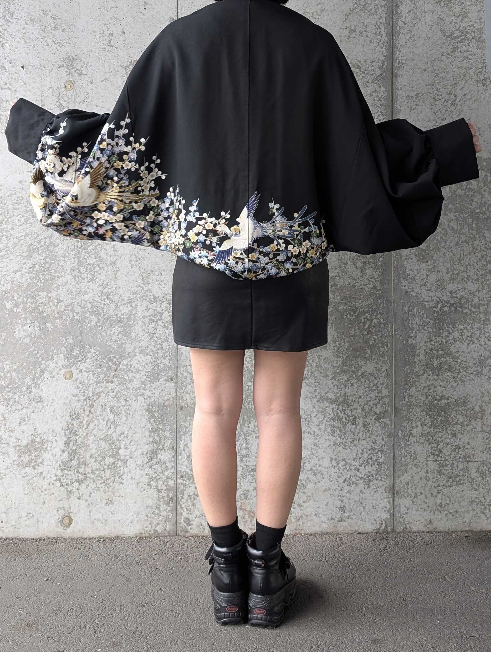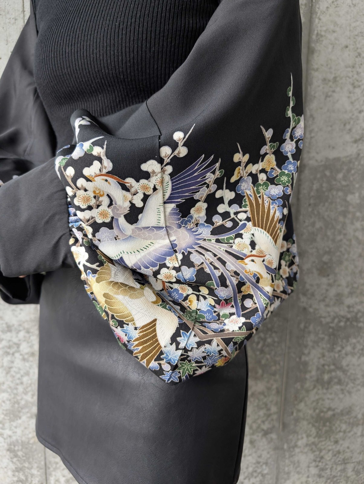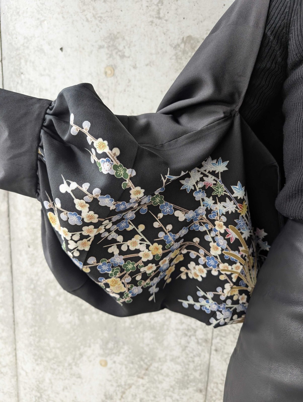 落款付きの黒留袖をリメイクした、バルーンスリーブが特徴のマーガレット。