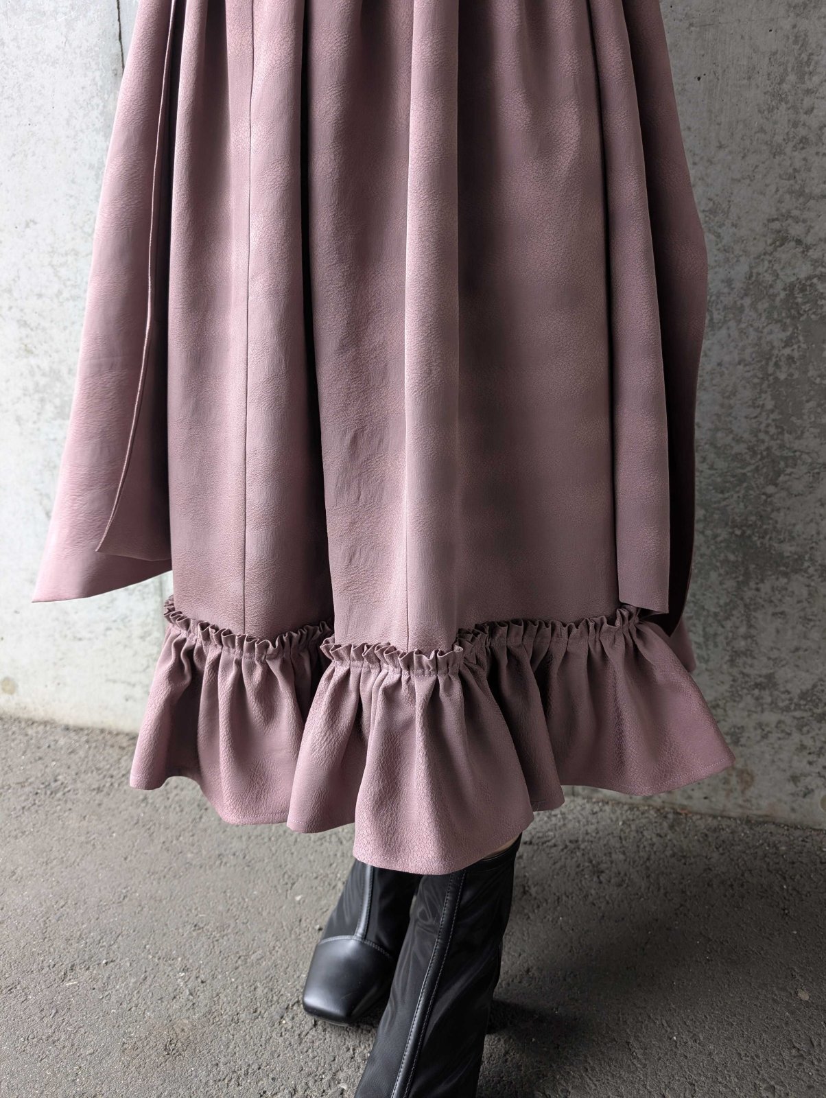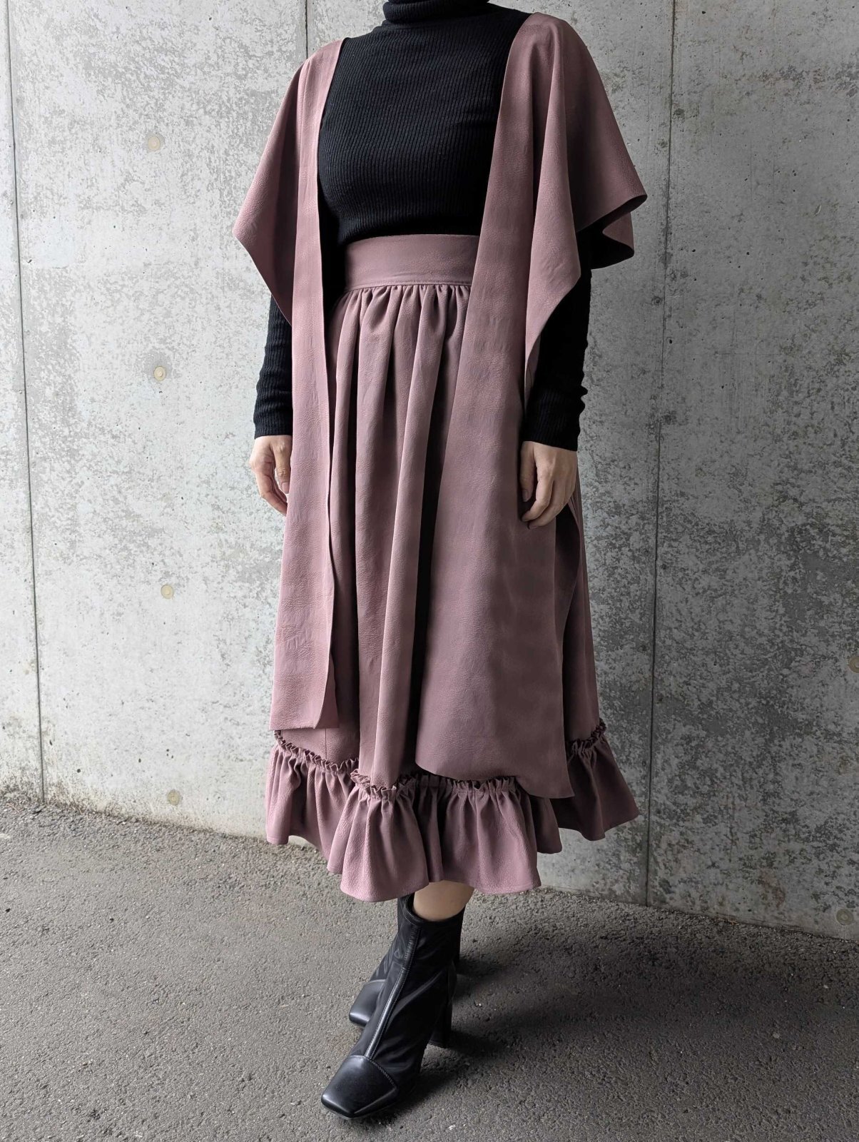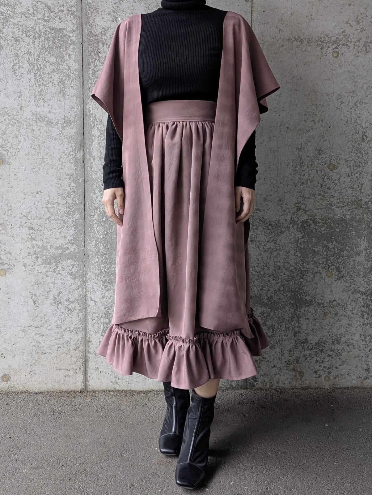 ストールを肩から垂直に垂らすことで直線的なラインを強調するほか、ウエストで結ぶ、あるいは内側にインすることで、着こなしを自在にコントロール可能。