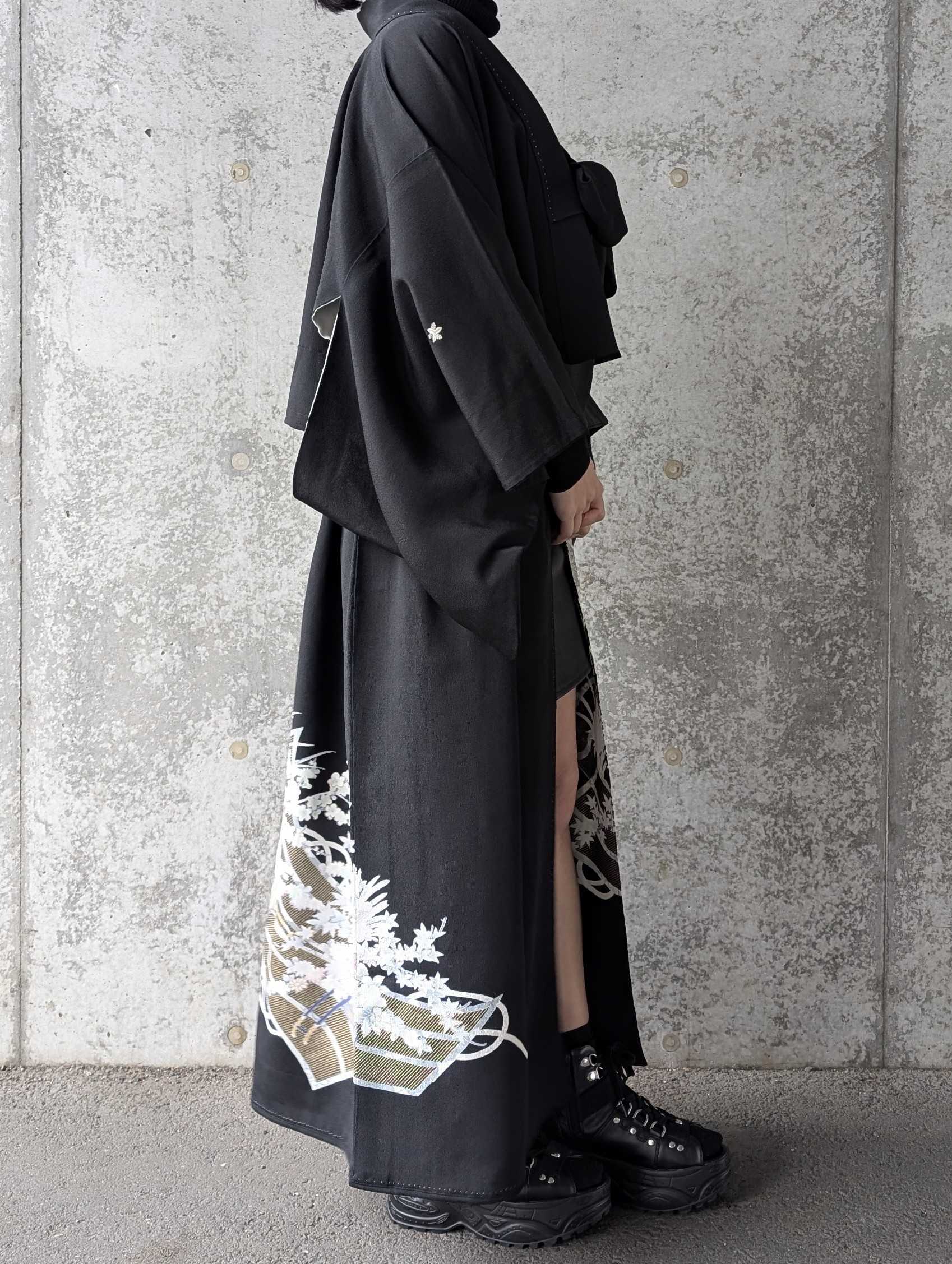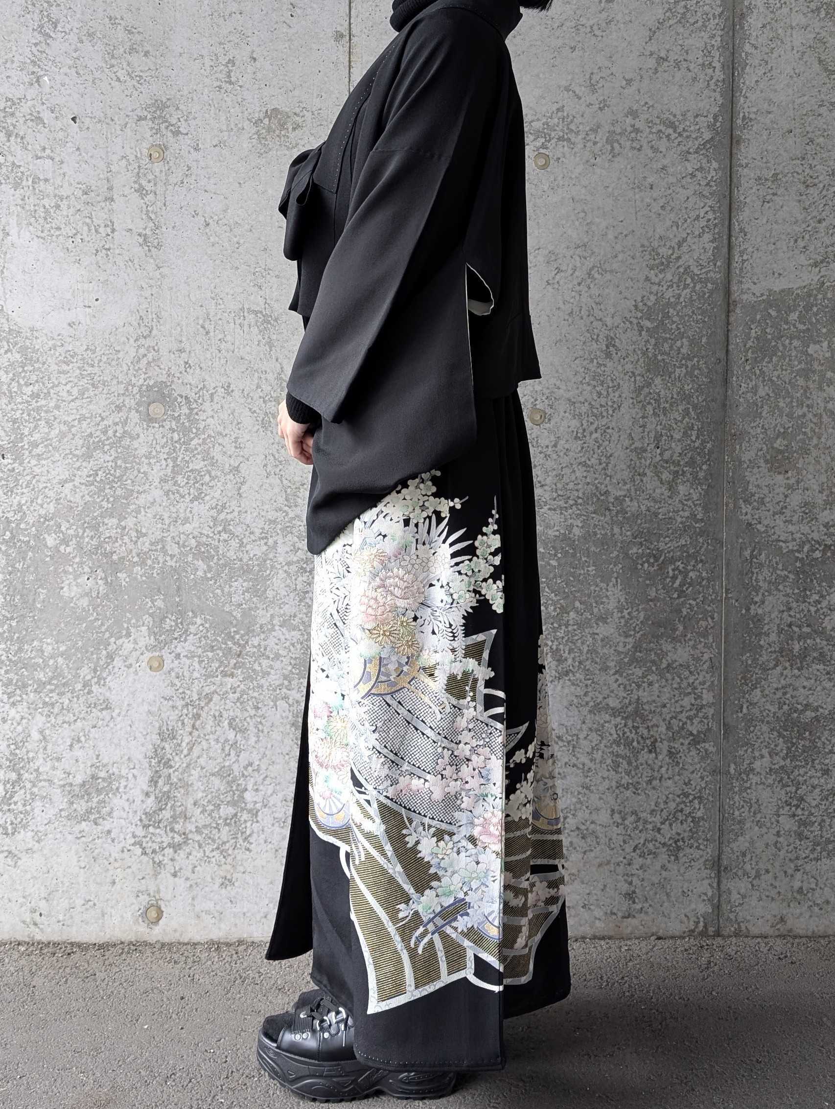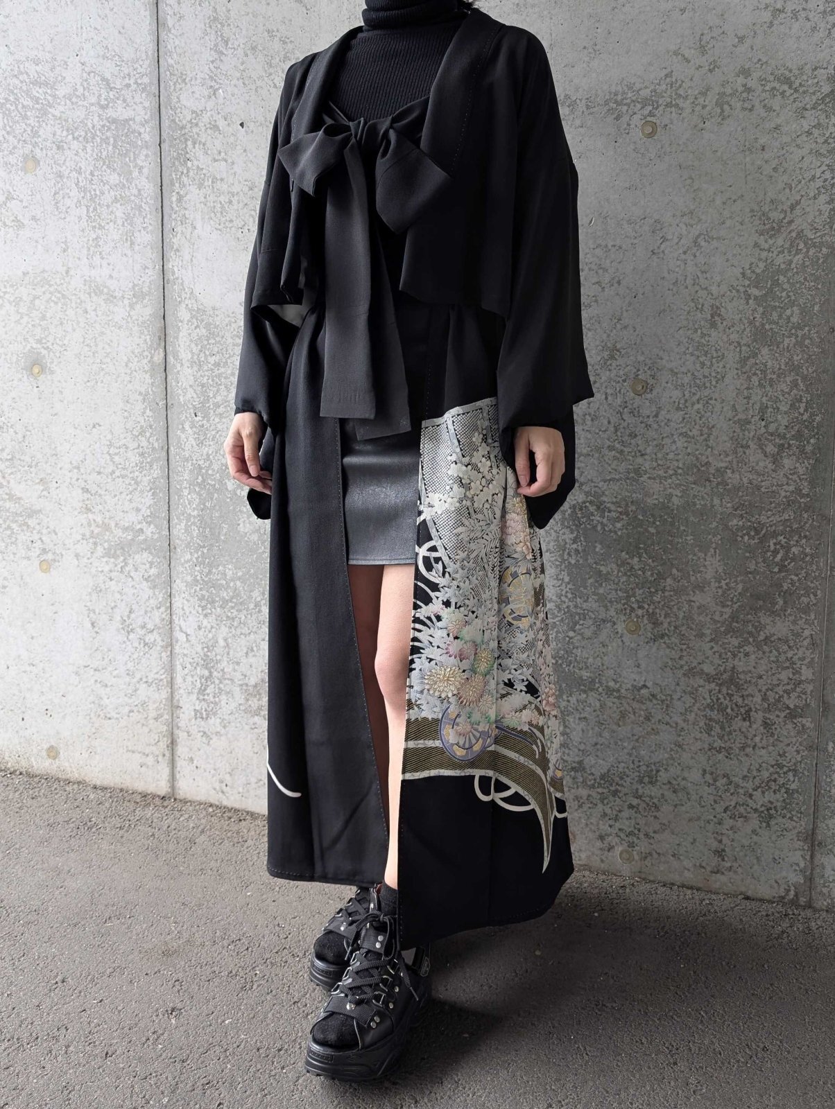 金駒牡丹の刺繍がきれいな黒留袖をリメイクしたオーバースカートとリボンジャケットのセットアップ。