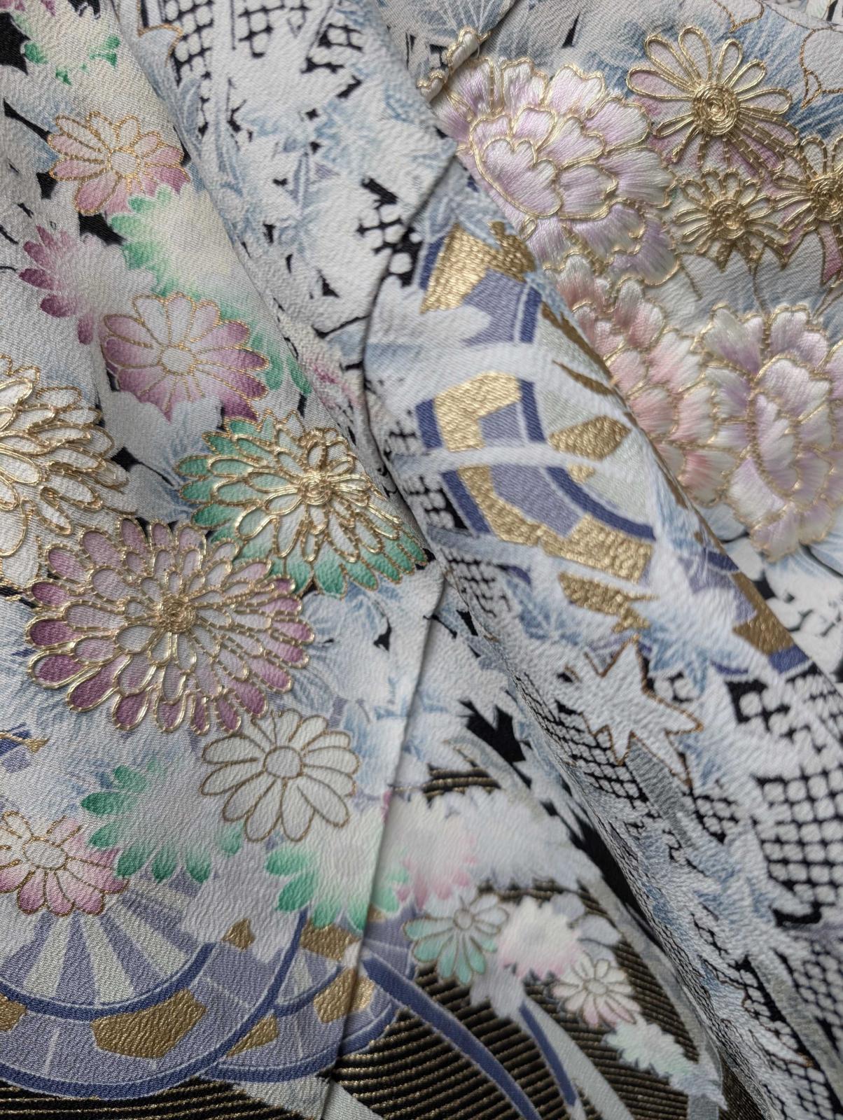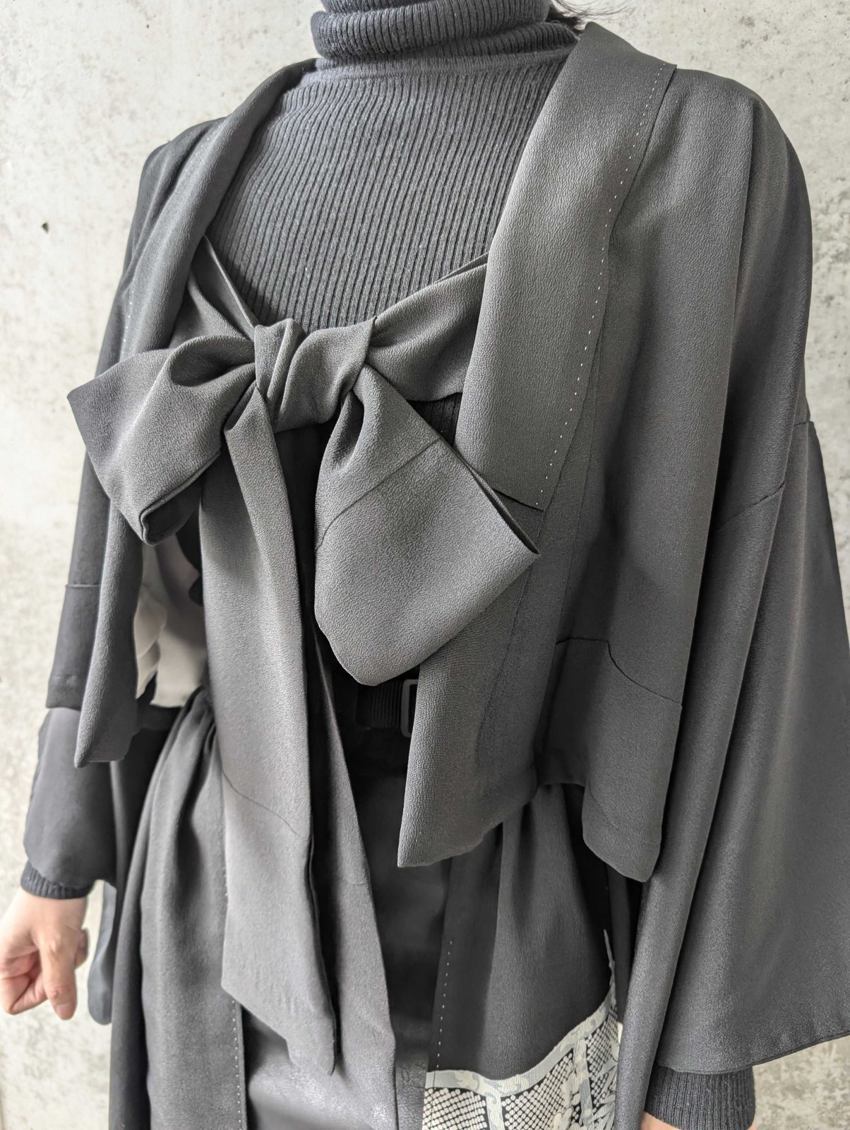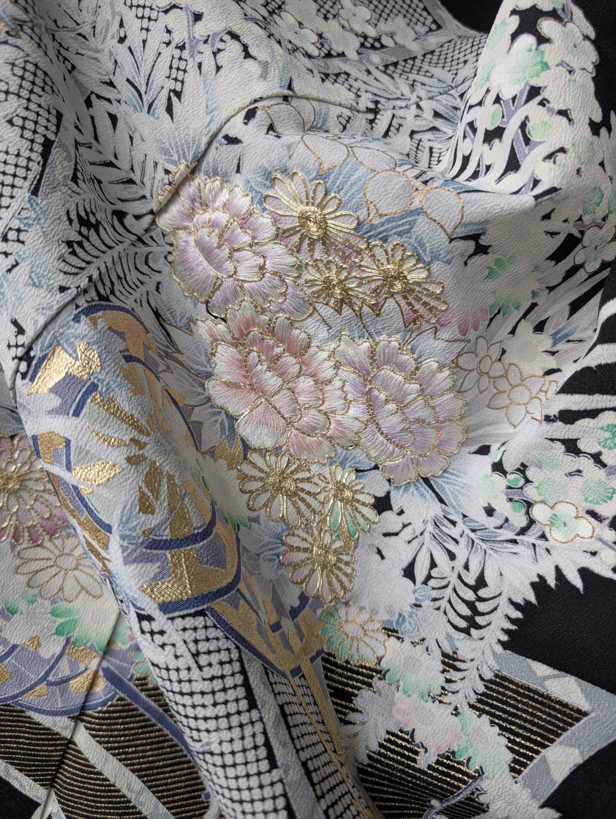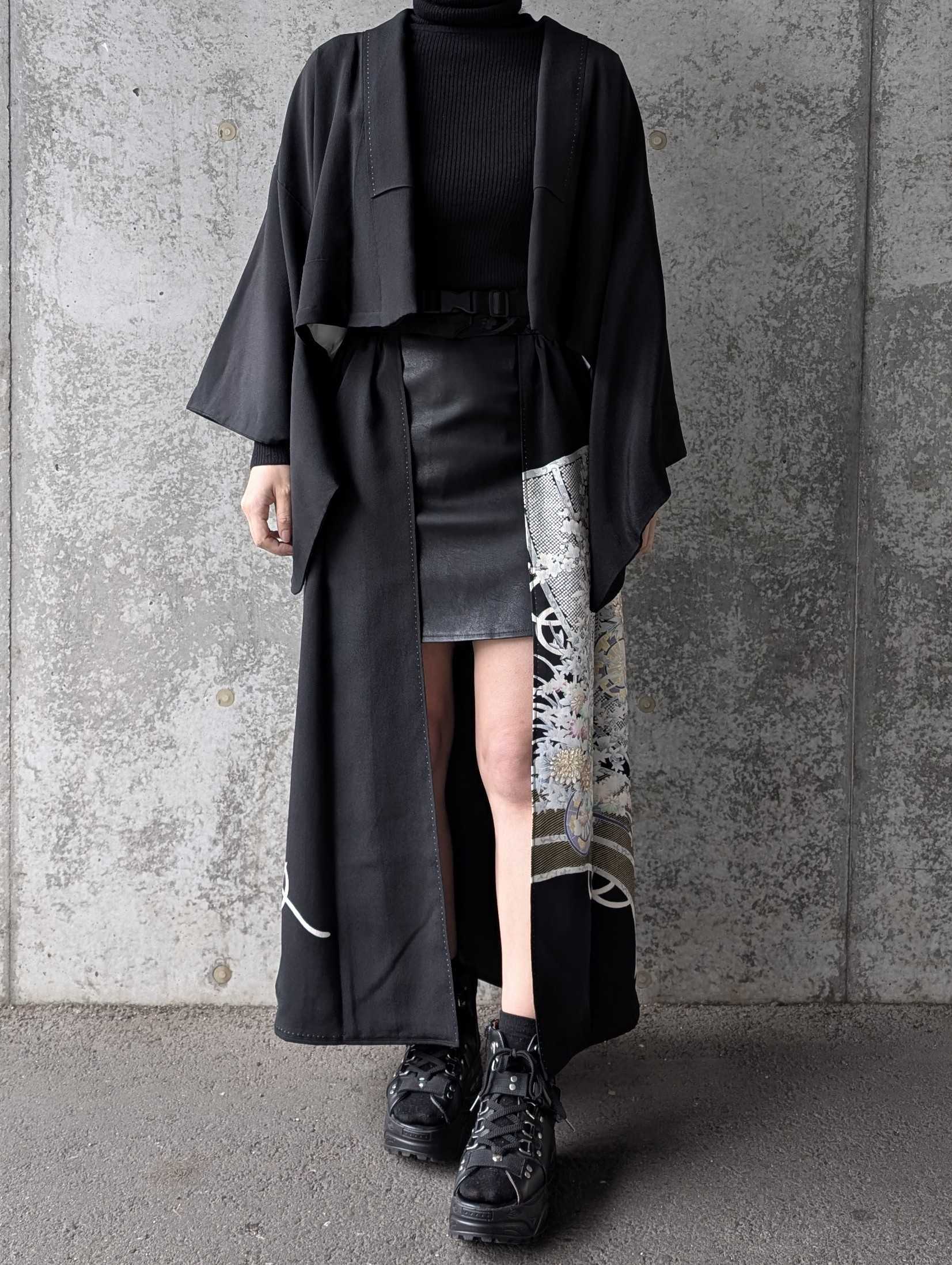 金駒牡丹の刺繍がきれいな黒留袖をリメイクしたオーバースカートとリボンジャケットのセットアップ。