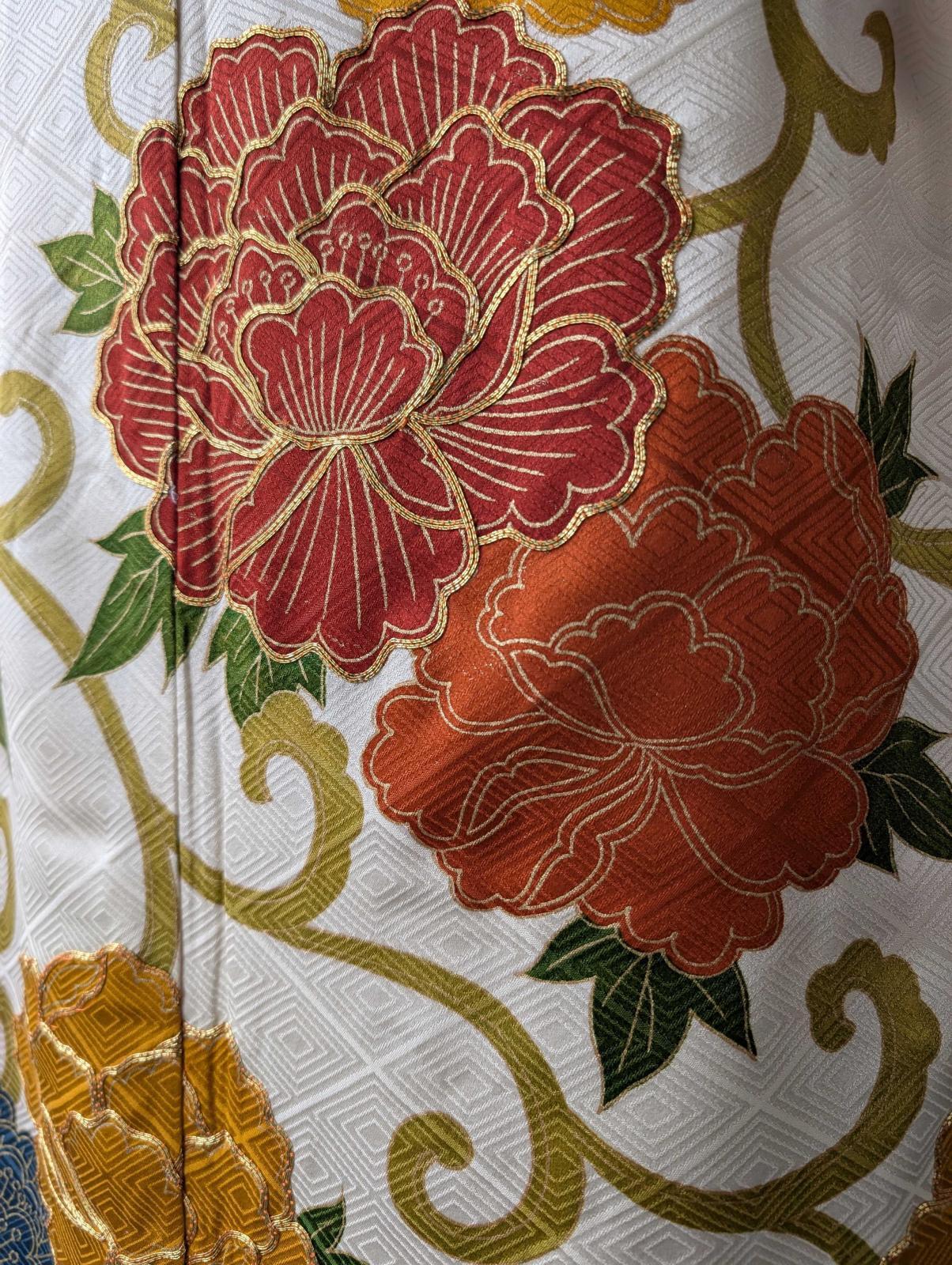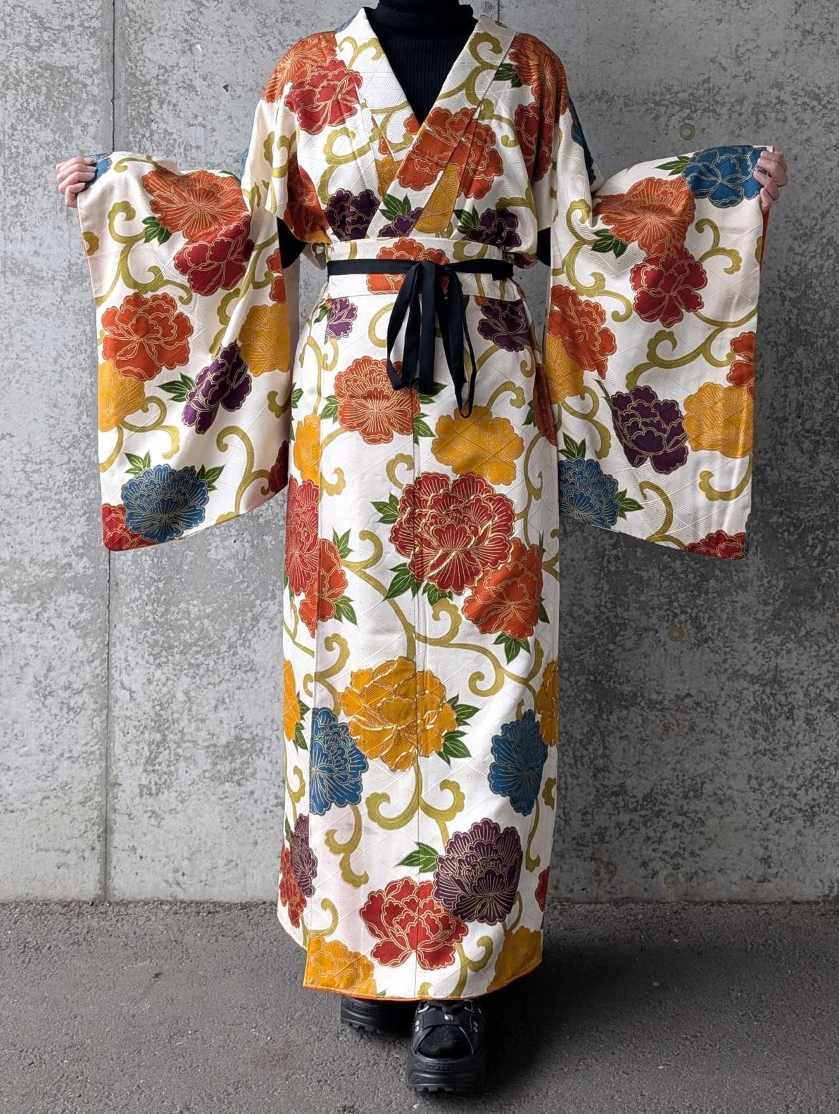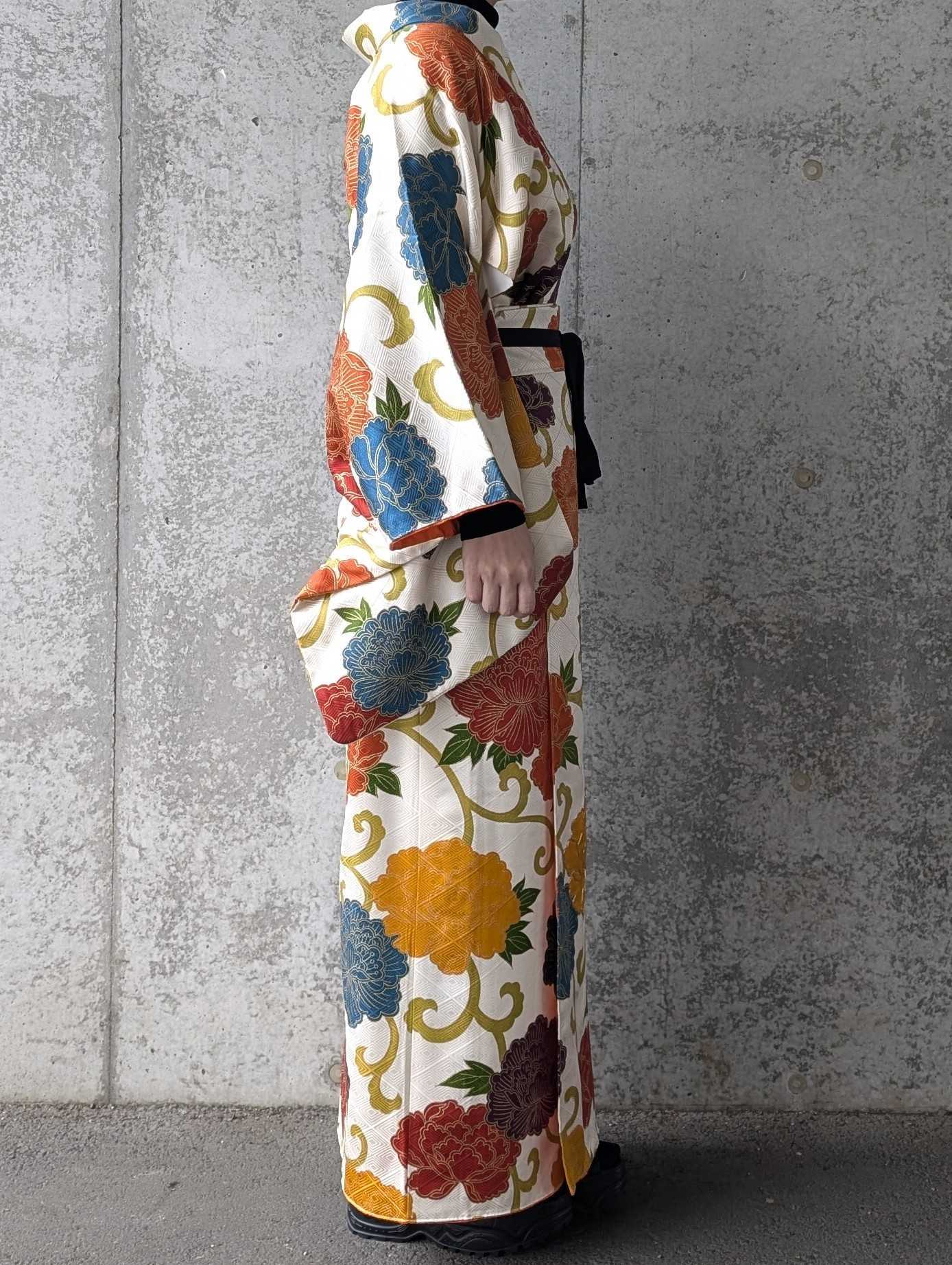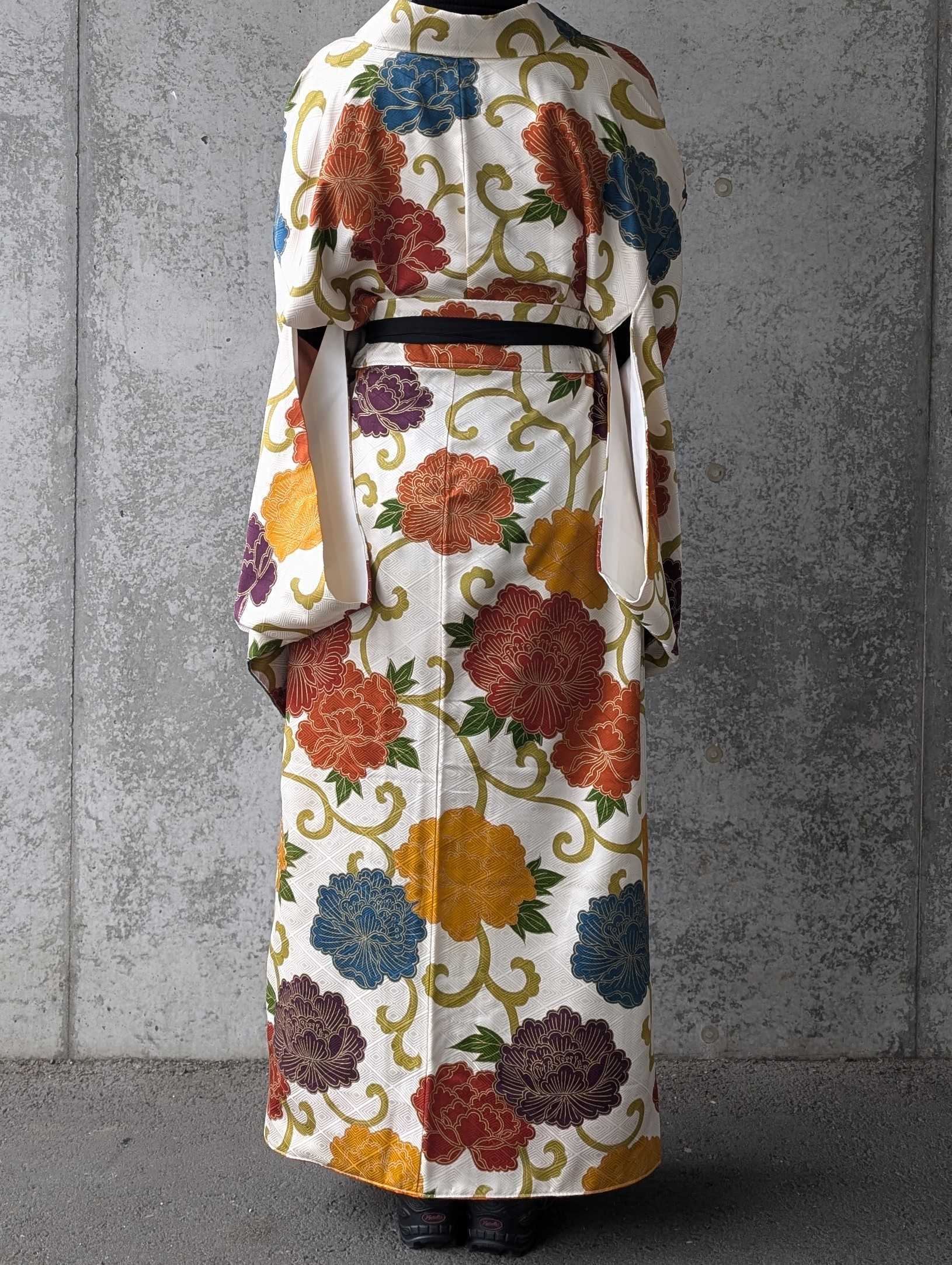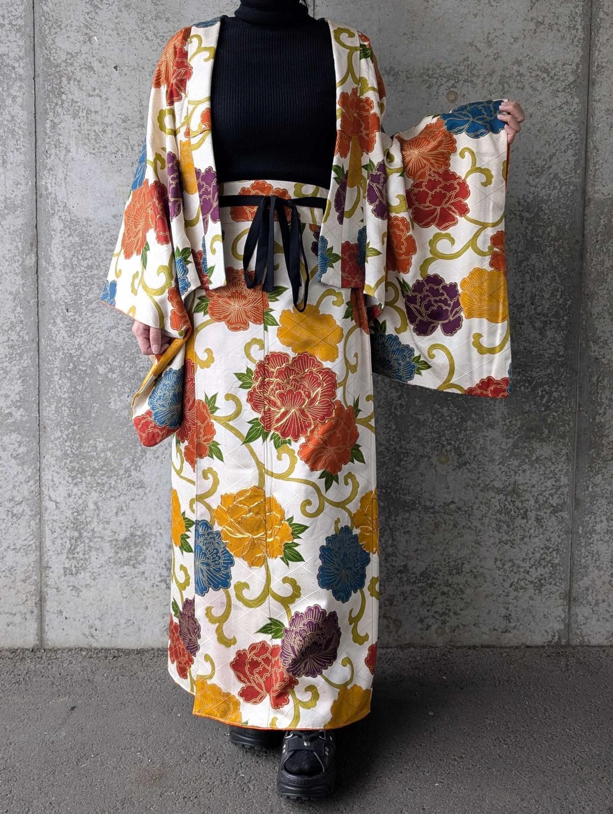 白地に大輪の牡丹柄の付け下げ小紋をリメイクしたセットアップ。