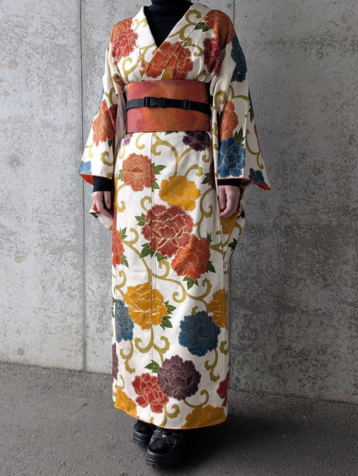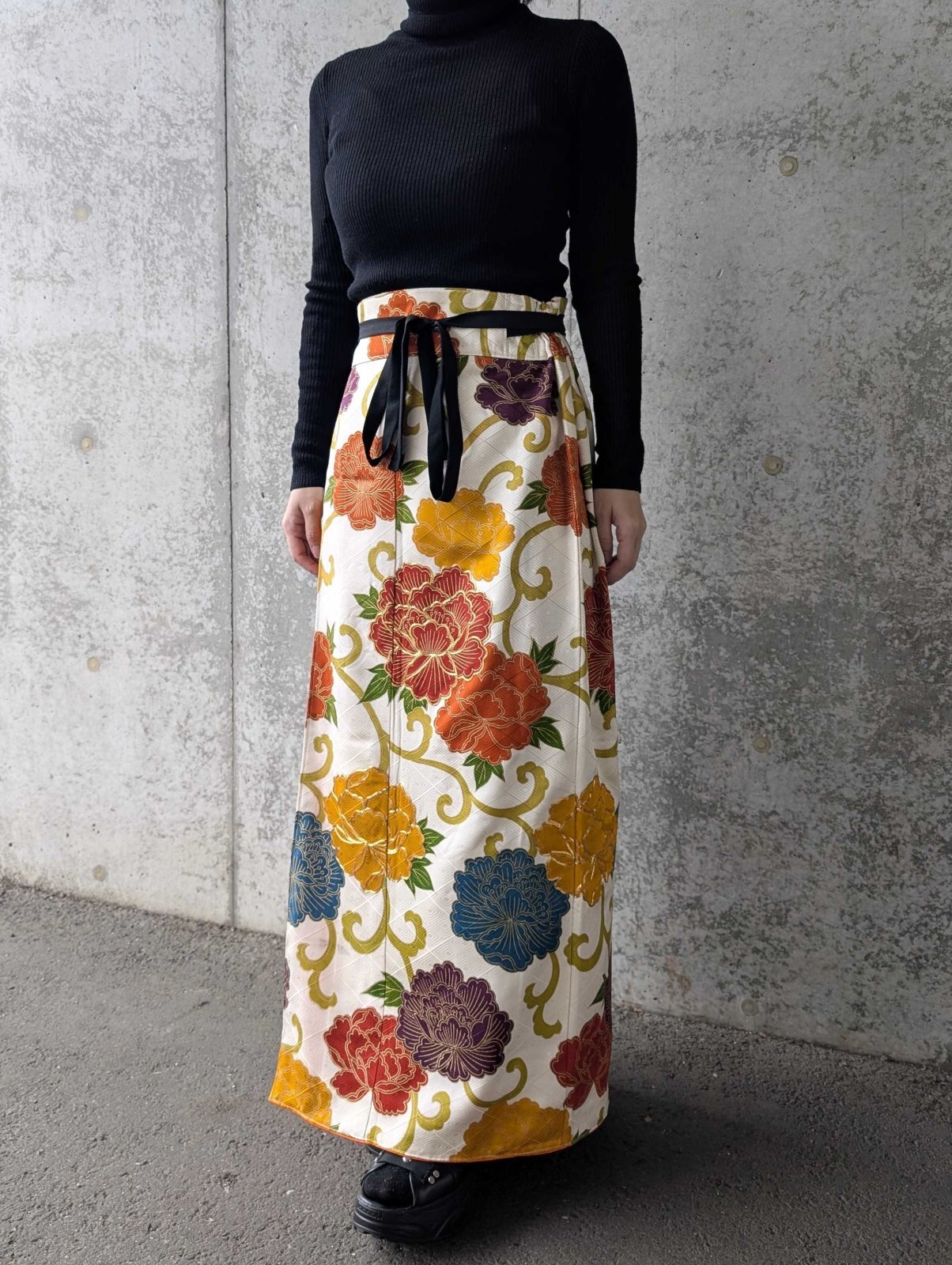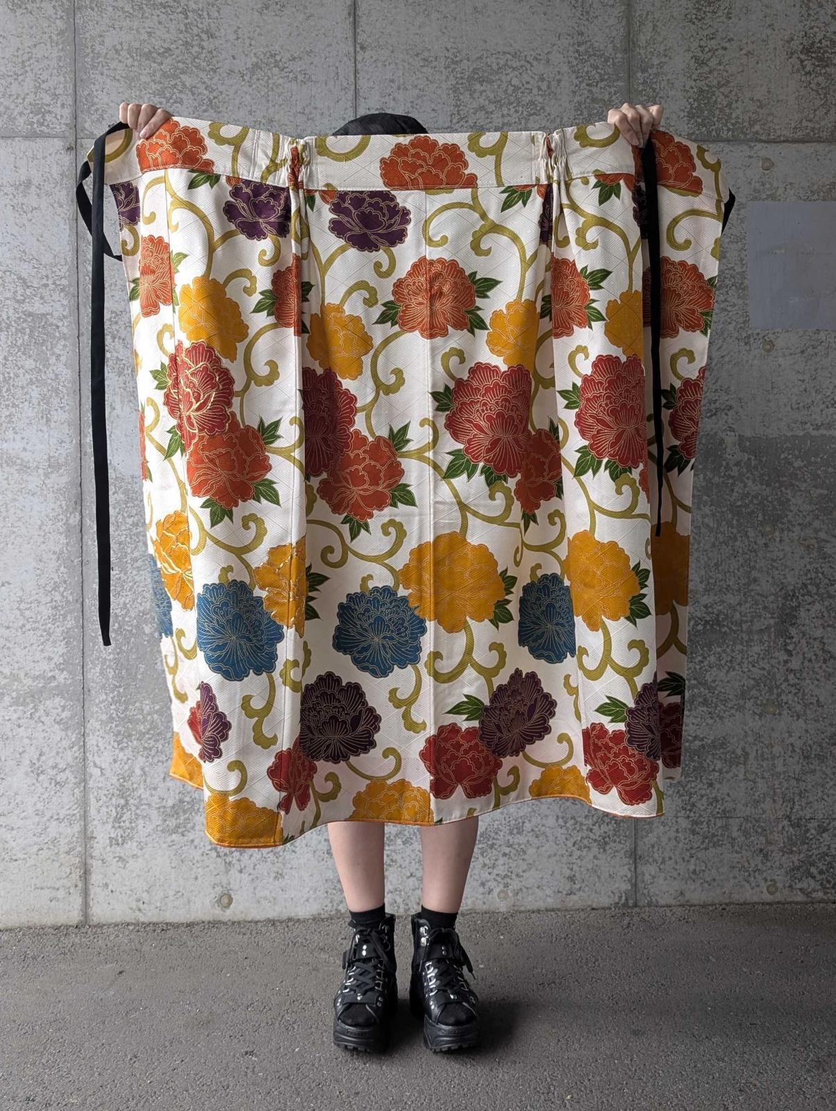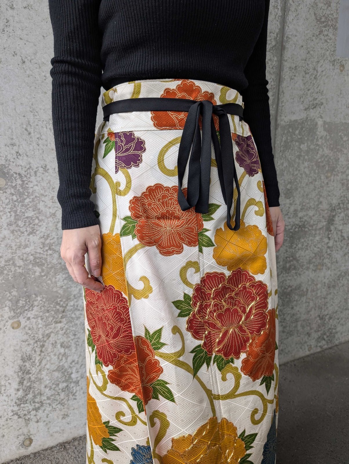 ラップスカートは紐部分にも着物地を使用しることで世界観を統一しています。